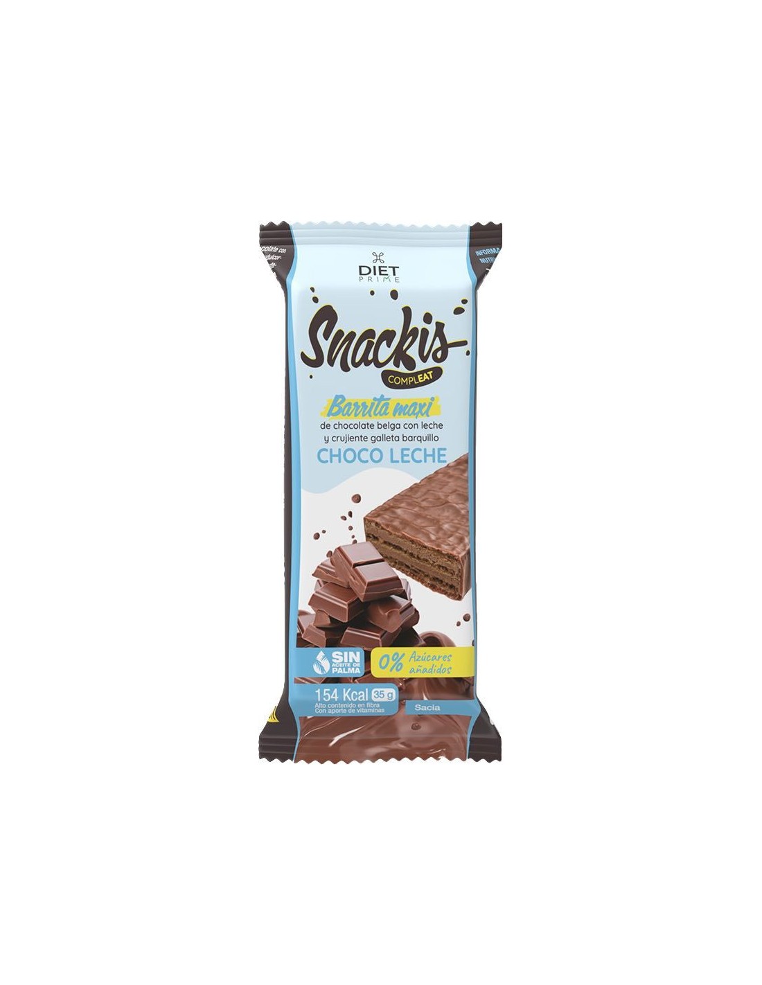 Las Snackis Compleat Diet prime de chocolate belga y crujiente galleta barquillo ofrecen una alternativa nutritiva. Con un contenido del 15% de la can