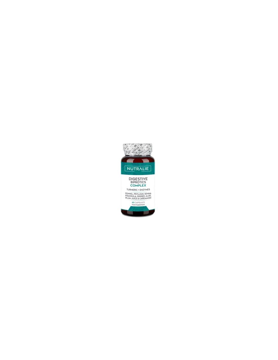 Digestive Biprotics Complex de Nutralie se ha desarrollado con el objetivo de contribuir en la mejora de la digestión, facilitando el proceso digestivo y el alivio de síntomas de digestiones pesadas, hinchazón e indigestión.Esta fórmula Complex Best In One de alta biodisponibilidad contiene además de probióticos y enzimas, otros ingredientes como cúrcuma, hinojo, psyllium, senna, frángula, jengibre, aloe vera, zumo de ciruela y cardamomo.Digestive Complex contribuye a aliviar los sintomas de dolor de aquellas personas que sufren de problemas de indigestión, malestar y pesadez tras las comidas.Composición activa por 2 cápsulas: