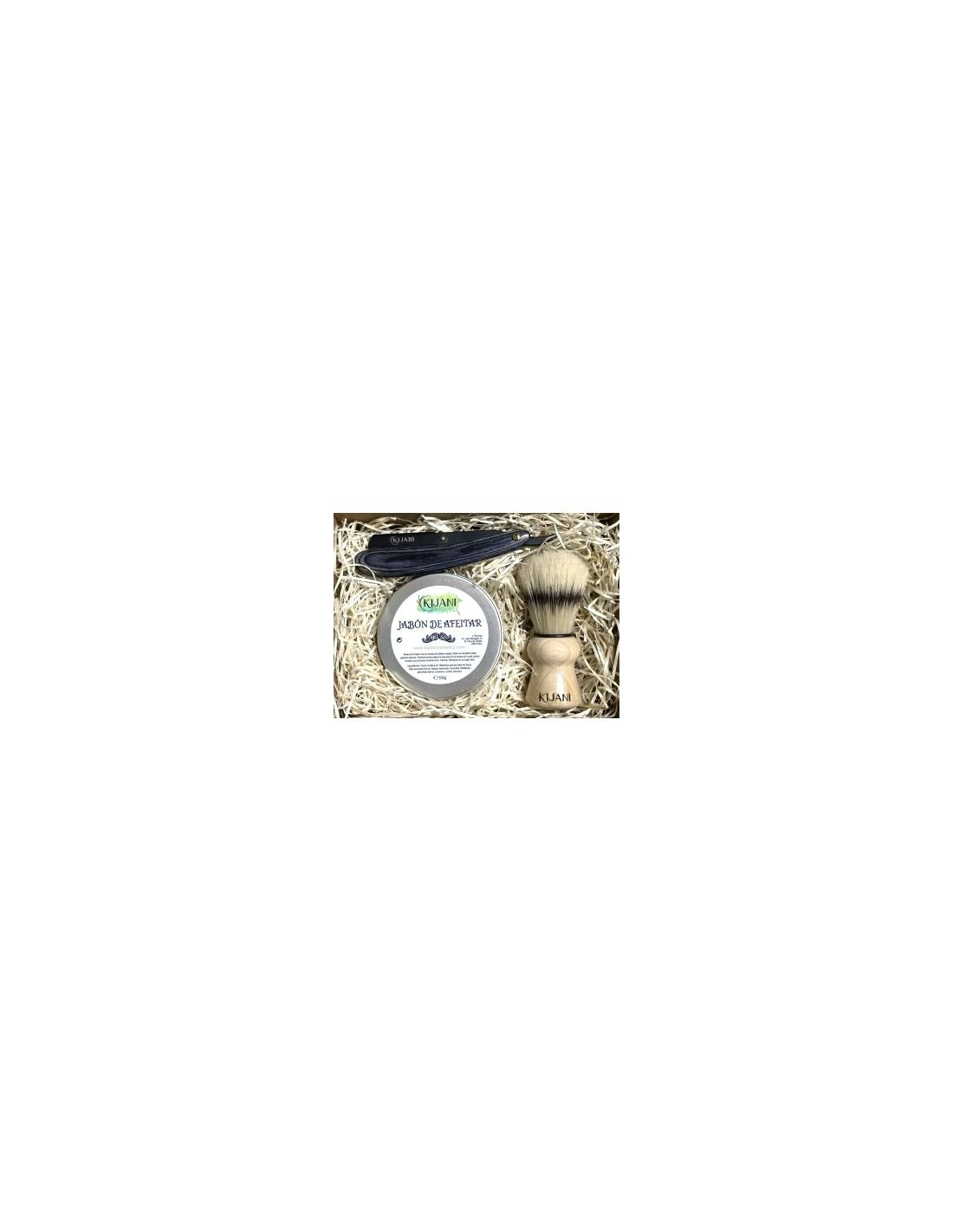 Pack de afeitar con un jabón de afeitado de lavanda, una navaja y una brocha de afeitar. Productos de artesanía para la barba.