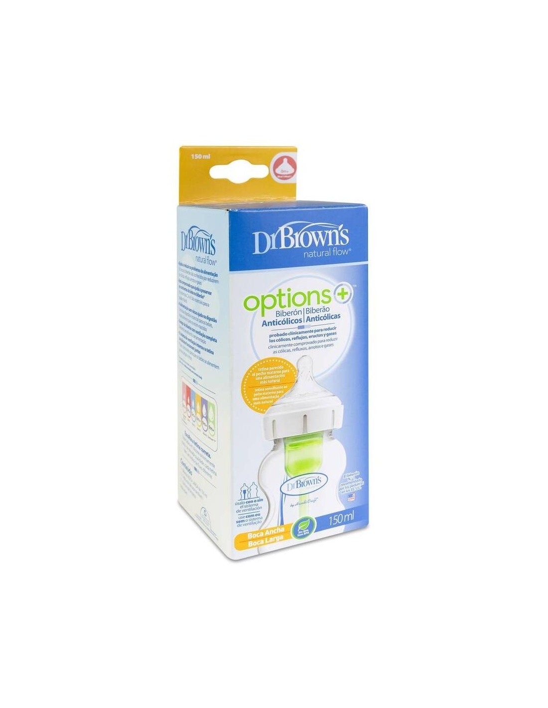 DR. BROWN´SSu forma y tetina más estrecha se adapta perfectamente a la boca del bebé. Sistema patentado de ventilación completa más resistente. Tapón ergonómico para abrir con una sola mano. Rosca reforzada. Tapa protectora para transportar de forma segura. Tetina de silicona médica.\ \ *El color y/o diseño del producto puede variar.