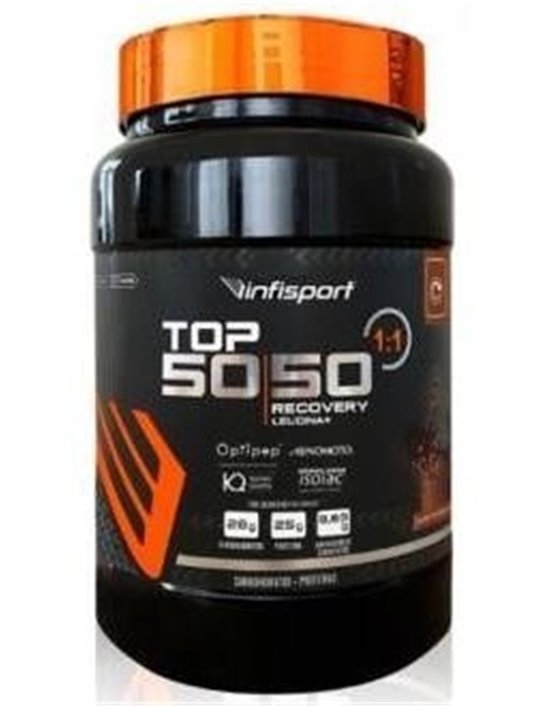 INFISPORTTOP 50/50® RECOVERY 1:1 LEUCINA+ combina carbohidratos de alto índice glucémico con proteínas de diferente velocidad de absorción en proporción 1:1, L leucina (100% Ajinomoto Co.) y L-glutamina (Kyowa Quality®). Además, es una fuente de vitaminas A, D, E, C y grupo B. Su contenido en vitamina C, B2, B3, B5, B6, B9 y B12 ayuda a disminuir el cansancio y la vitamina C, E y B2 contribuye a la protección de las células frente al daño oxidativo. Todo ello permite obtener un batido de alta concentración proteica, sin gluten, bajo en lactosa y grasas de fácil asimilación; aportando por servicio 25 g de proteína de alto valor biológico. Por su proporción entre carbohidratos, proteínas y demás nutrientes presentes en su formulación, está recomendado para la recuperación tras la práctica de actividades deportivas de alta intensidad y 1 hora de duración.
