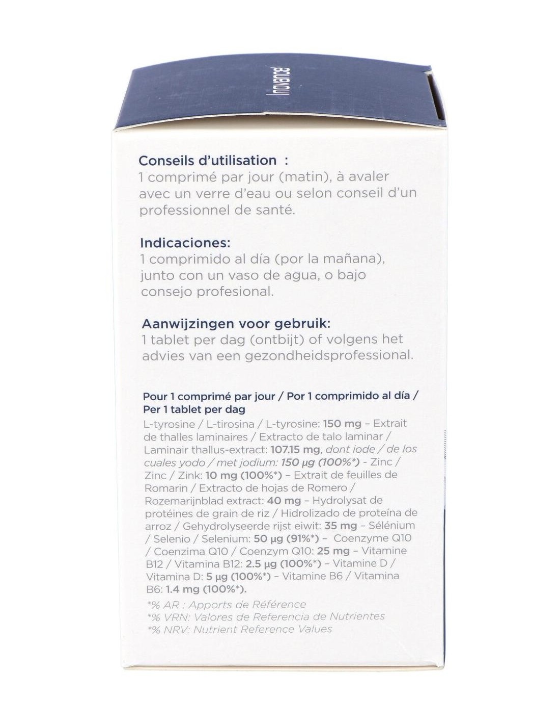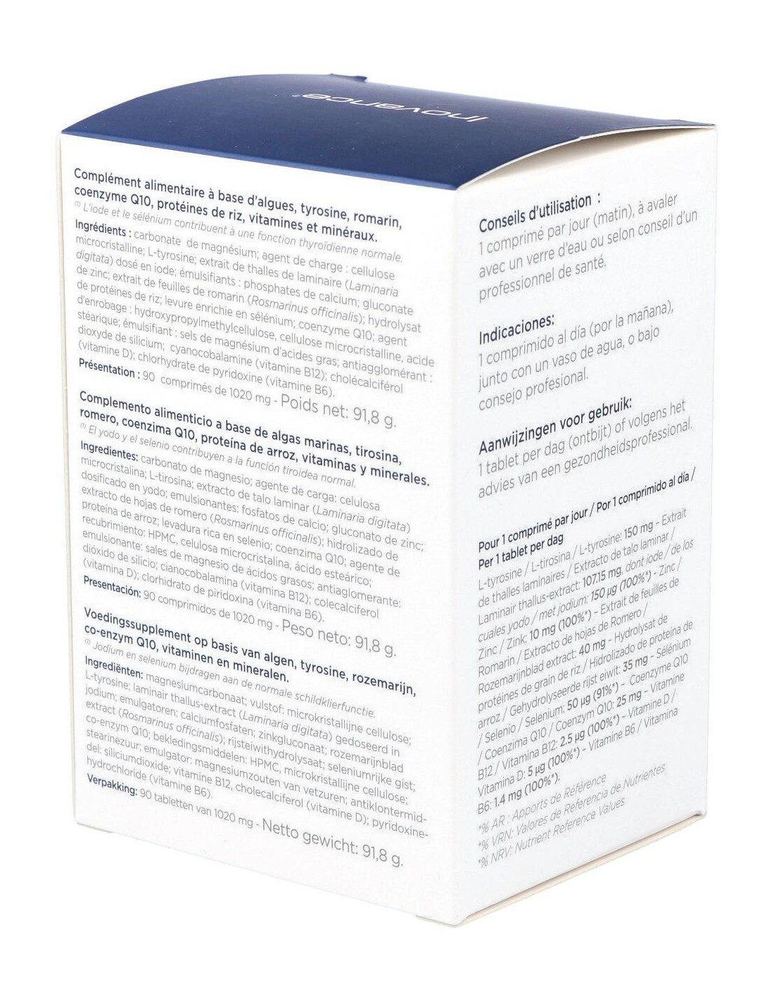 Complemento alimenticio a base de algas marinas ricas en iodo, tirosina, romero, coenzima Q10, zinc, selenio, vitaminas B6-B12-D. Ayuda a reforzar la tiroide.