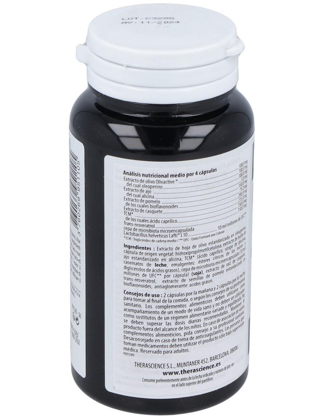 Extracto de hoja de olivo titulado en oleuropeína, recubrimiento de origen vegetal, extracto de bulbo de ajo titulado en alicina, MCT (ácido caprílico, jarabe de glucosa, caseinatos de leche , emulgentes: ésteres de ácido cítrico de monoglicéridos y diglicéridos), cepa de microbiota microencapsulada (10 mil millones UFC por cápsula) ( soja ), extracto de raíz de escutelaria, trans-resveratrol, extracto de semillas de pomelo titulado en bioflavonoides, antiaglomerante: ácidos grasos.