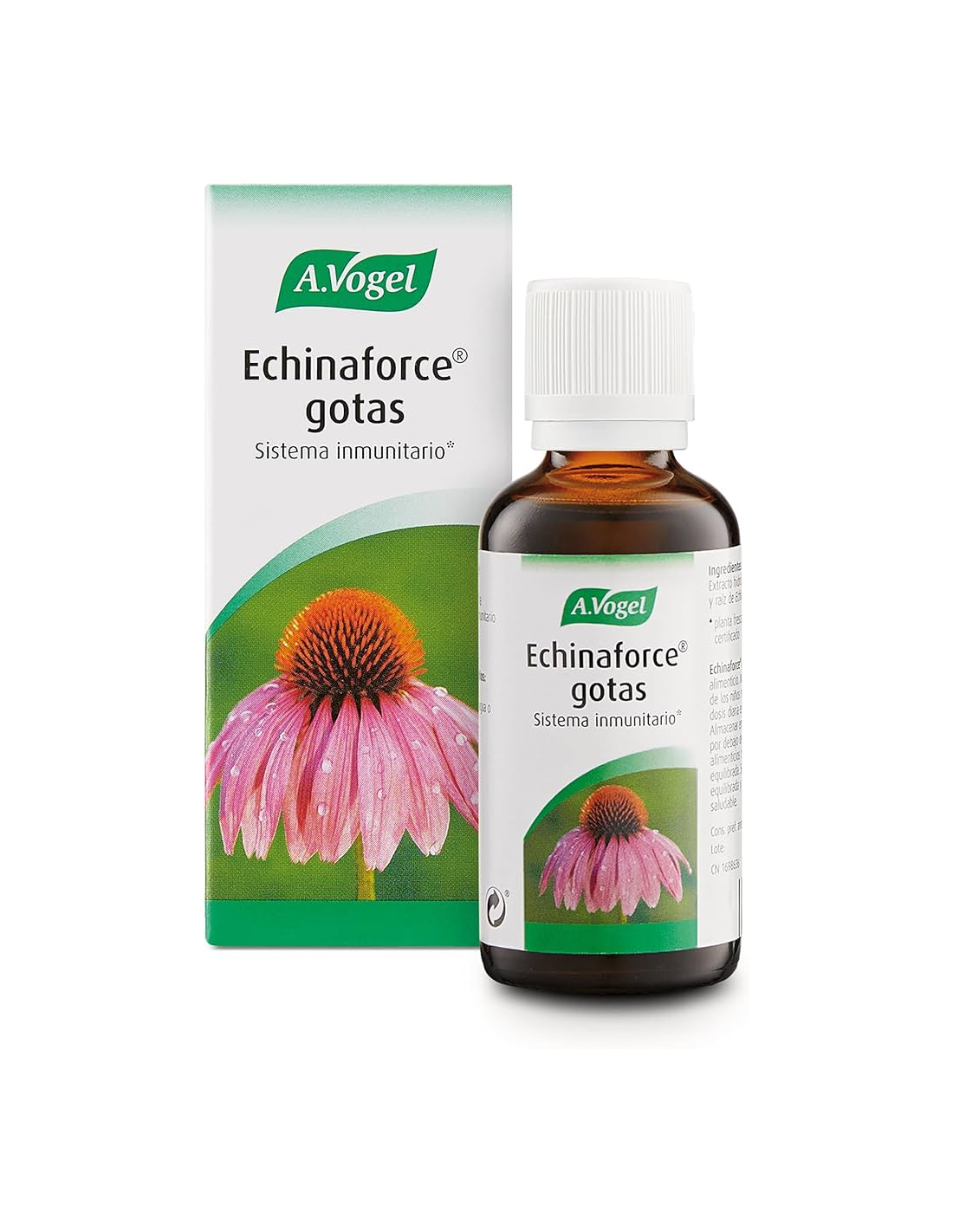 Este complemento alimenticio sirve principalmente para fortalecer el sistema inmune. La equinácea, su compuesto principal, es muy utilizada para estos fines por su función antivírica, antiinflamatoria y analgésica.Propiedades:Originariamente la equinácea era utilizada con fines medicinales por los indios de Norteamérica, especialmente en picaduras de serpiente y de insectos. En los años cincuenta del siglo XX, Alfred Vogel conoció de la mano de Alce Negro, jefe sioux, los beneficios de esta planta y llevó sus semillas hasta sus plantaciones en Suiza, donde desarrolló el productos Echinaforce, elaborado con equináceas frescas, recién recolectadas y de cultivo biológico. Echinaforce demuestra en vitro una amplia gama de actividad antiviral contra diversos virus, entre ellos varios subtipos de la influencia (H1N1, H3N2, H5N1, H7N7), y es también un poderoso agente antibacteriano. Echinaforce antúa a modo antiinflamatorio e inmunomodulador, inhibiendo así la excesiva liberación de moléculas mediadoras de la inflamación (TNFa y las interleukinas IL-6 y IL-8), causantes de la sintomatología de una gripe o en un resfriado común. Indicaciones uso oral: