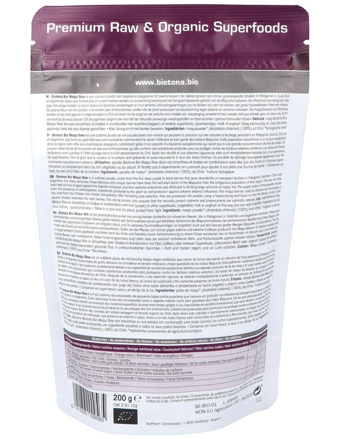 Maqui Raw Powder de BIOTONA es un superalimento natural en polvo, elaborado a partir de bayas de maqui 100% puras y crudas. Rico en antioxidantes, ayuda a proteger las células del estrés oxidativo y contribuye al bienestar general. Ideal para añadir a batidos, yogures o jugos, aporta un sabor dulce y ligeramente ácido que realza tus recetas diarias. Sin aditivos ni conservantes, es una opción saludable para quienes buscan cuidar su salud de forma natural y sencilla.