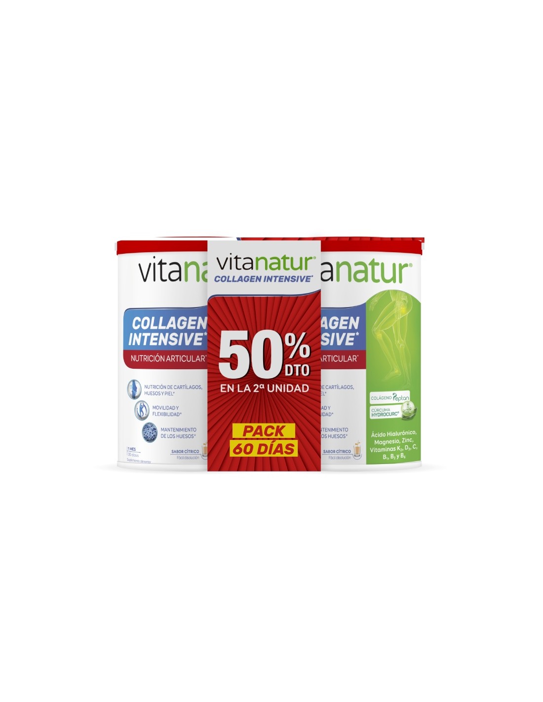 El Collagen Intensive 360G 2 Unidad 50% de Vitanatur es un suplemento nutricional para adultos que contribuye al mantenimiento de la piel y articulaciones, formulado con colágeno hidrolizado para una mejor absorción.