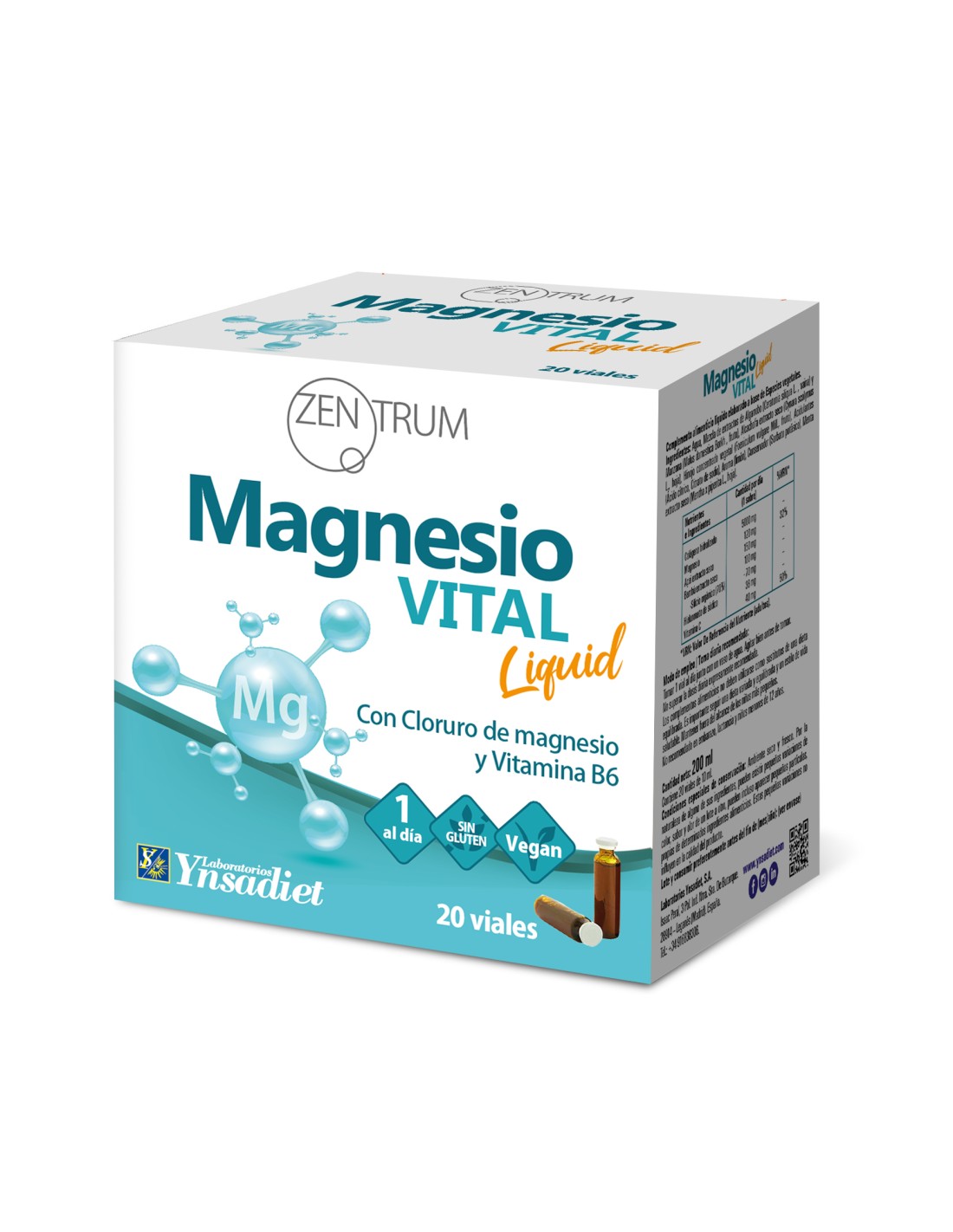 Magnesio Vital Liquid de Zentrum Ynsadiet es un complemento en formato vial que combina 250 mg de magnesio y 3,5 mg de vitamina B6 por dosis diaria, en una fórmula líquida de alta absorción, sin gluten y apta para personas veganas. El magnesio es un mineral esencial que interviene en más de 300 funciones del organismo, ayudando al funcionamiento muscular y nervioso, a la producción de energía, al mantenimiento de los huesos y al equilibrio del sistema cardiovascular.