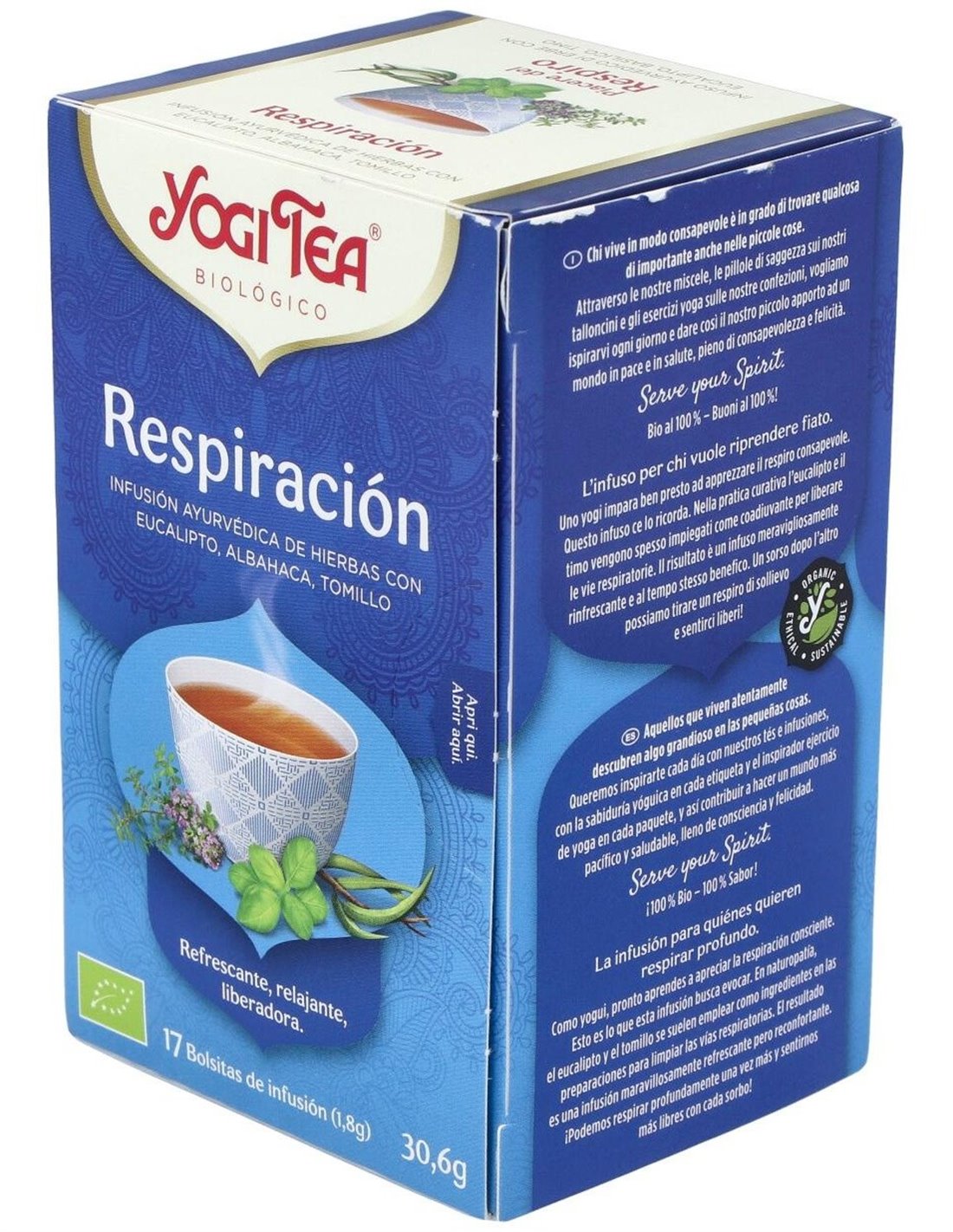 El Yogi Tea Respiración 17 x 1,8 g es una infusión diseñada para personas que buscan apoyar su bienestar respiratorio, combinando hierbas seleccionadas que facilitan una sensación de frescura y alivio natural.