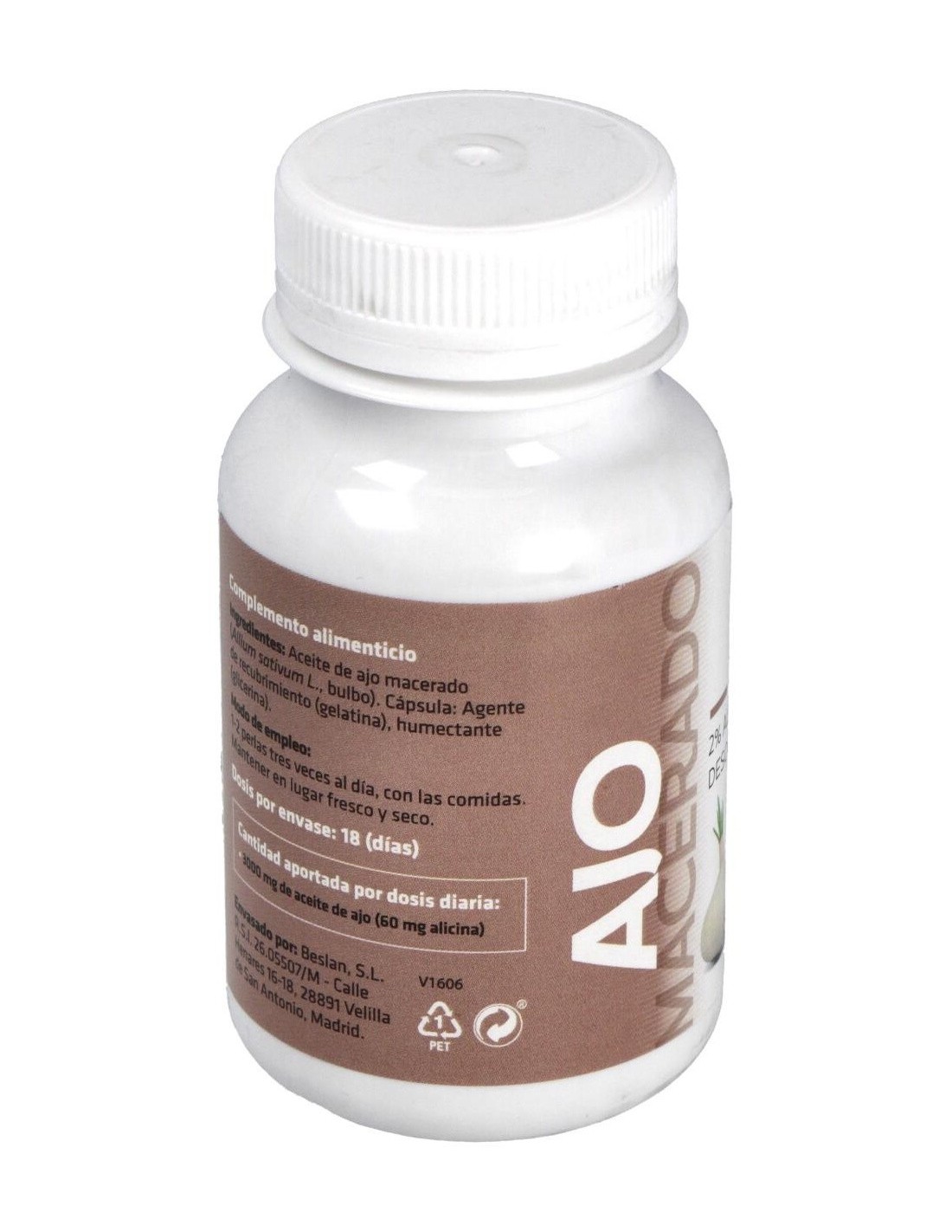 El producto está elaborado con ajo macerado de calidad, encapsulado para preservar sus propiedades y facilitar su consumo. Su diseño compacto y sin sabor fuerte lo hace adecuado para quienes buscan integrar ajo en su alimentación sin complicaciones.