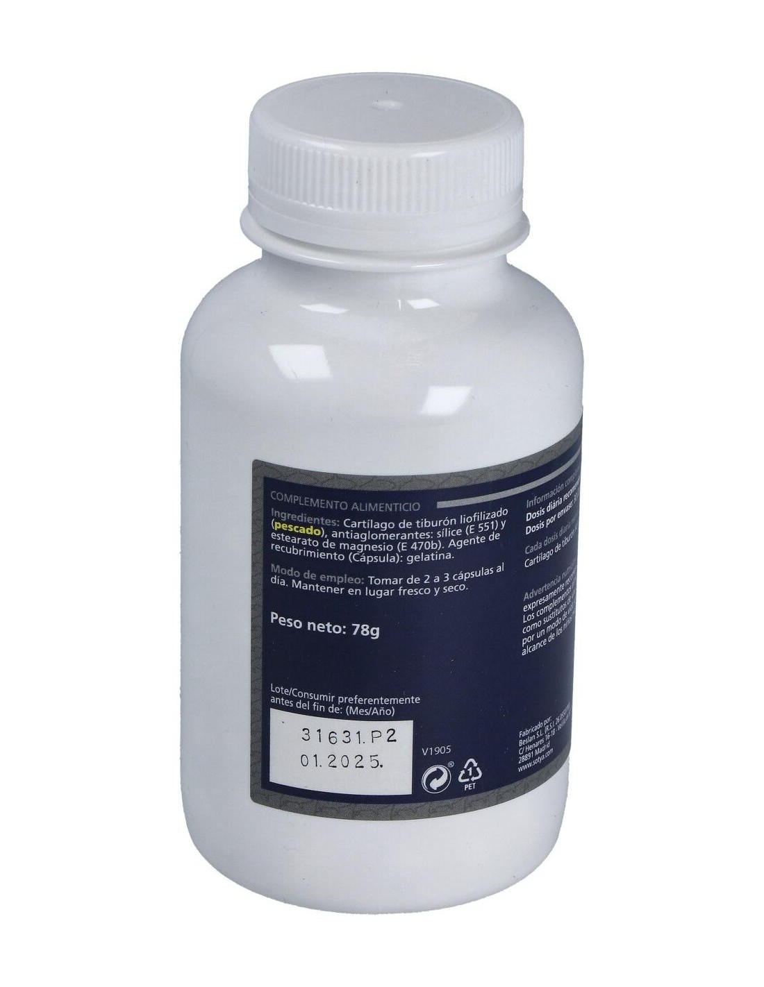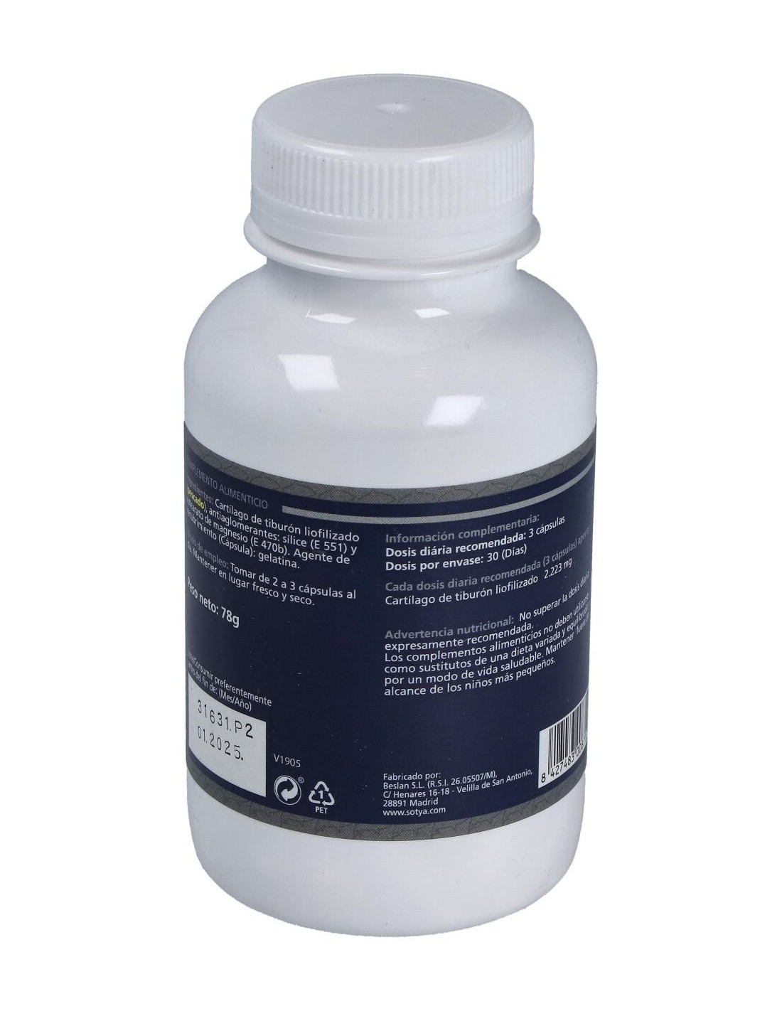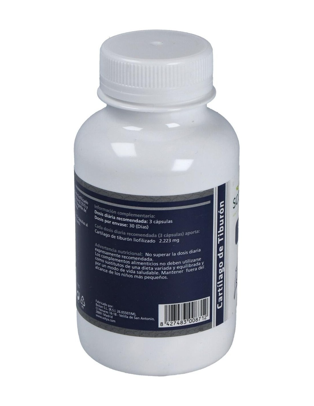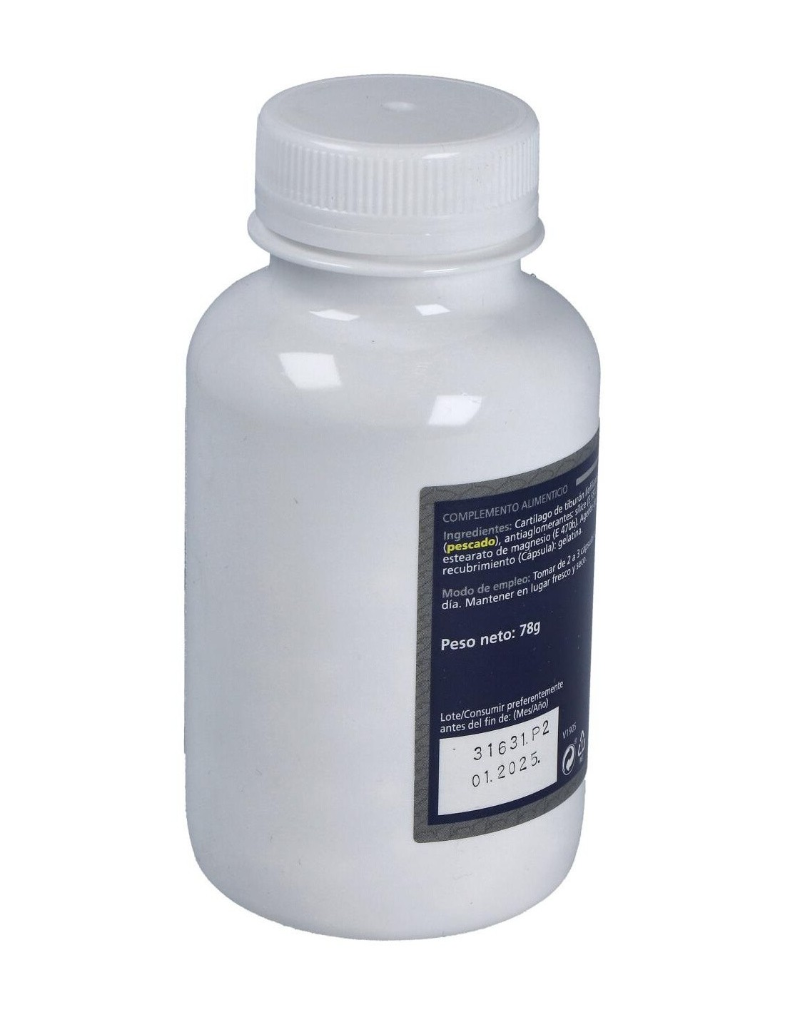 - Cada cápsula contiene 870 mg de cartílago de tiburón, facilitando una ingesta controlada y práctica.