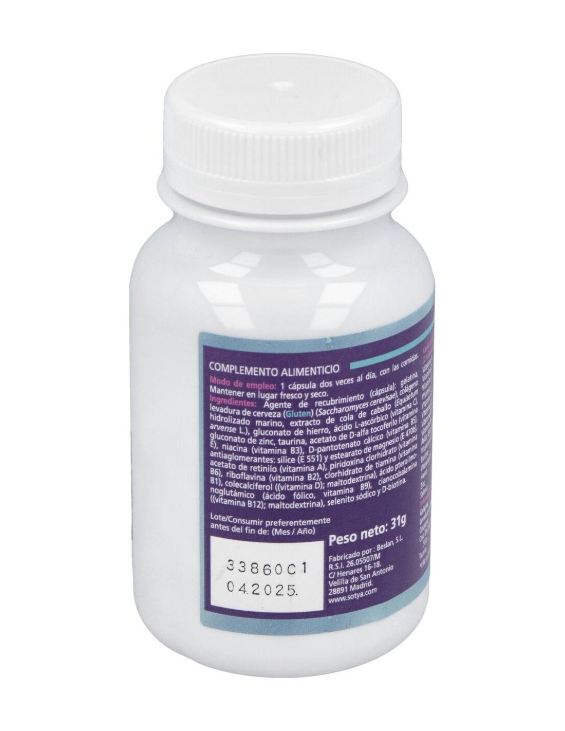 Este producto combina ingredientes cuidadosamente seleccionados para aportar nutrientes esenciales que contribuyen al mantenimiento de la piel, el cabello y las uñas. Su diseño en cápsulas permite una administración cómoda y práctica, adaptándose a diferentes estilos de vida.