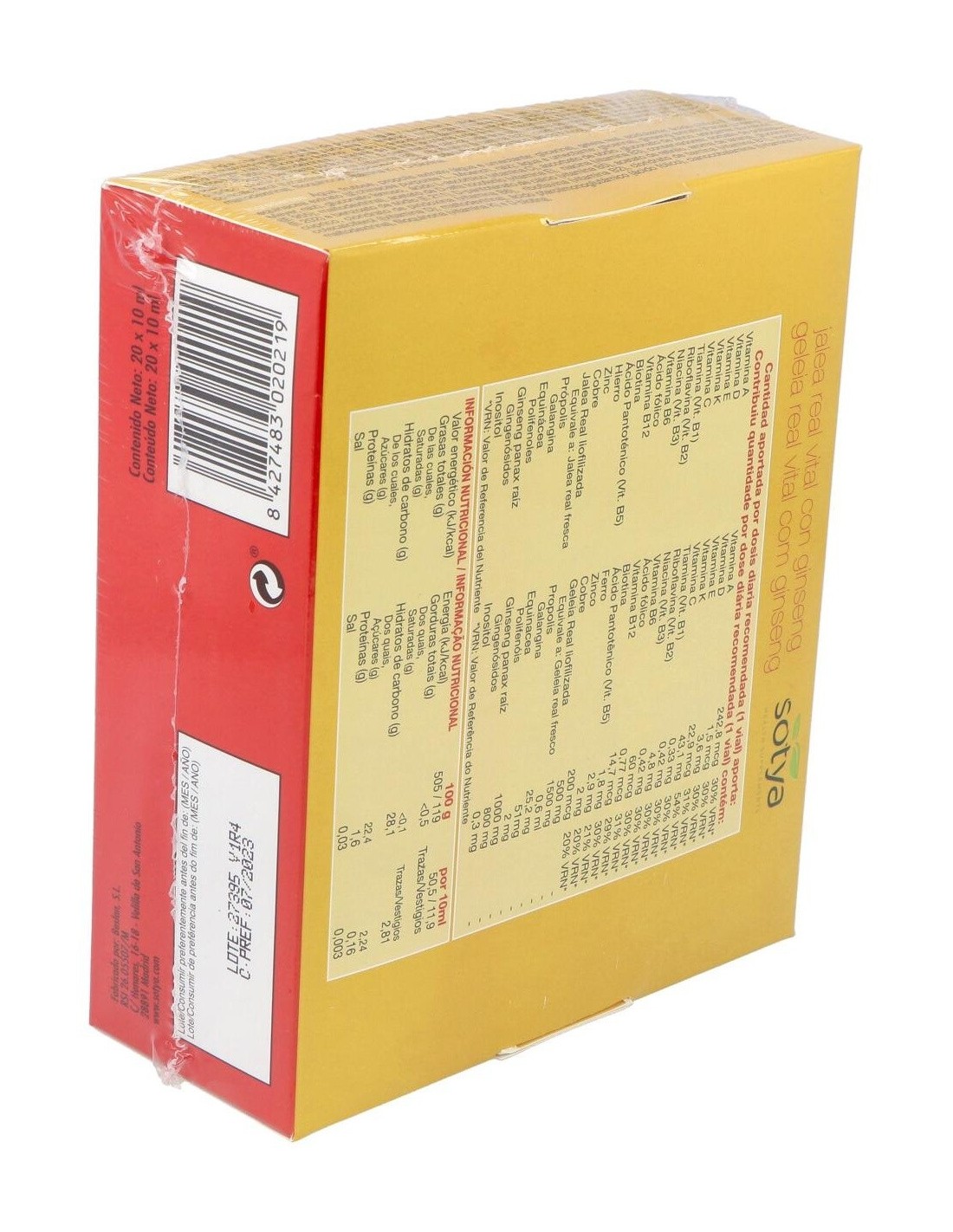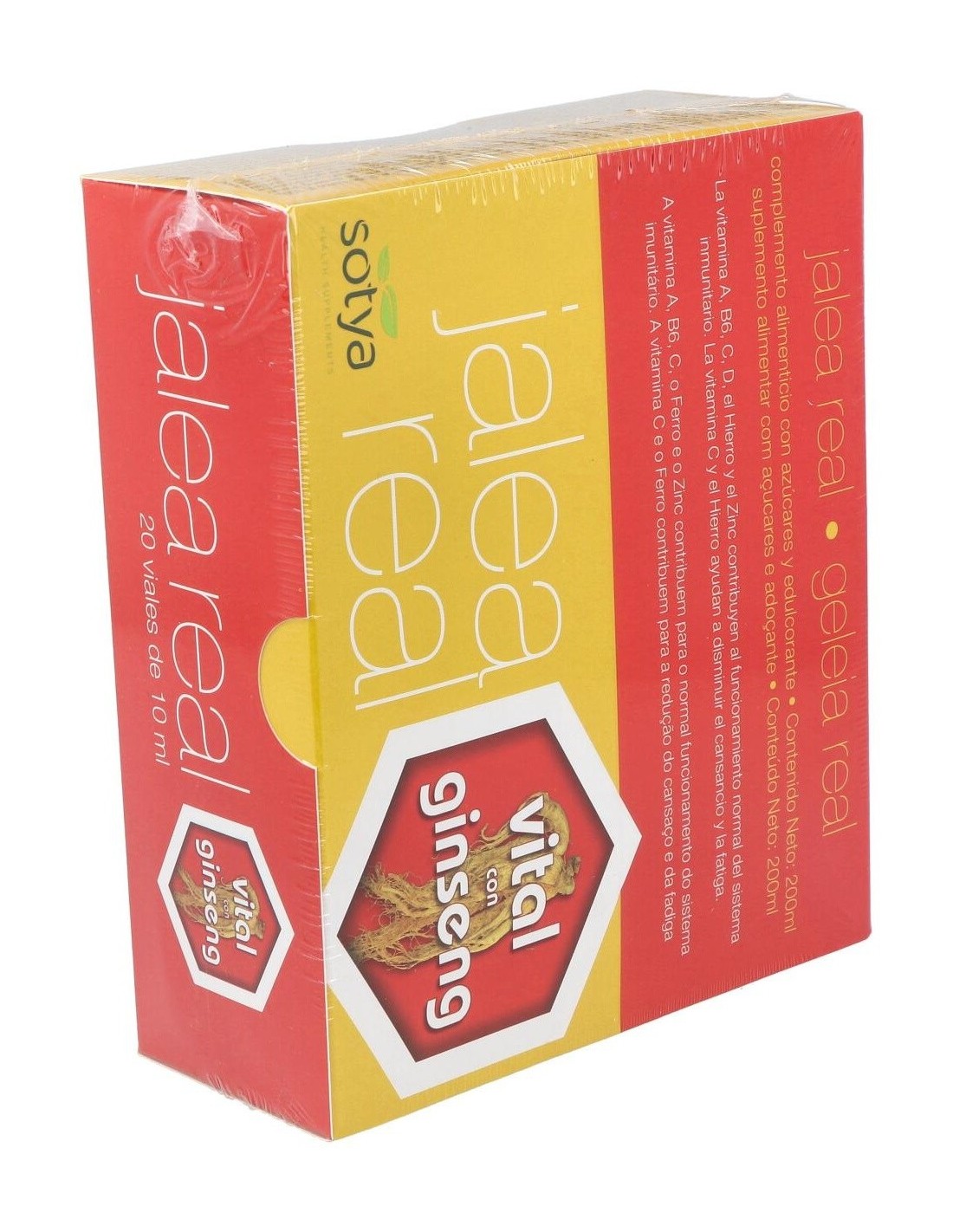La Jalea Real Vital con Ginseng 10ml viales vidrio 20U de Sotya es un suplemento natural para adultos que busca apoyar la vitalidad diaria mediante la combinación de jalea real y ginseng en presentaciones individuales.