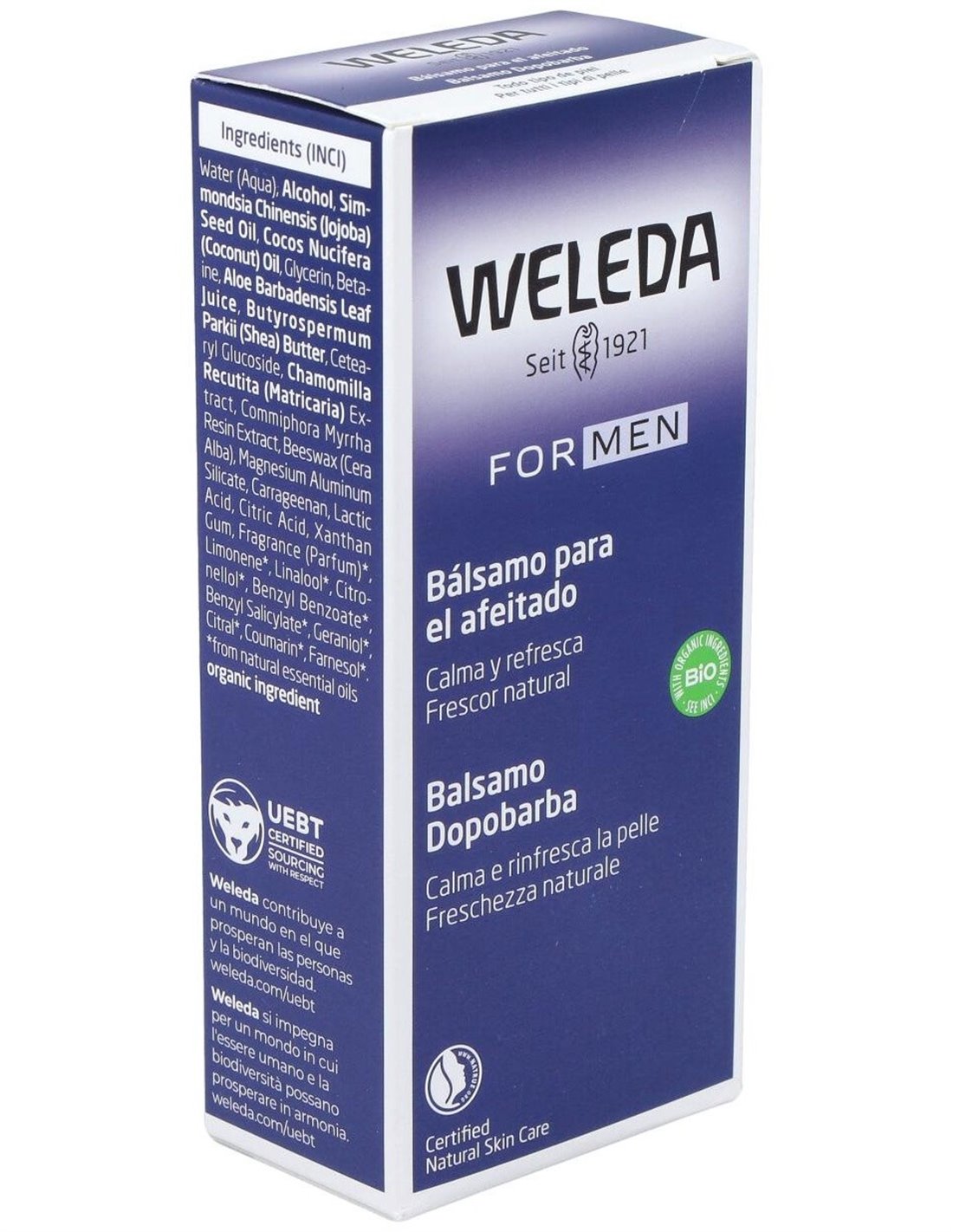 El Bálsamo After Shave (FOR MEN), 100ml de Weleda está diseñado para hombres que buscan un cuidado facial suave y equilibrado después del afeitado. Su fórmula está pensada para calmar la piel y aportar una sensación de frescura sin irritaciones.