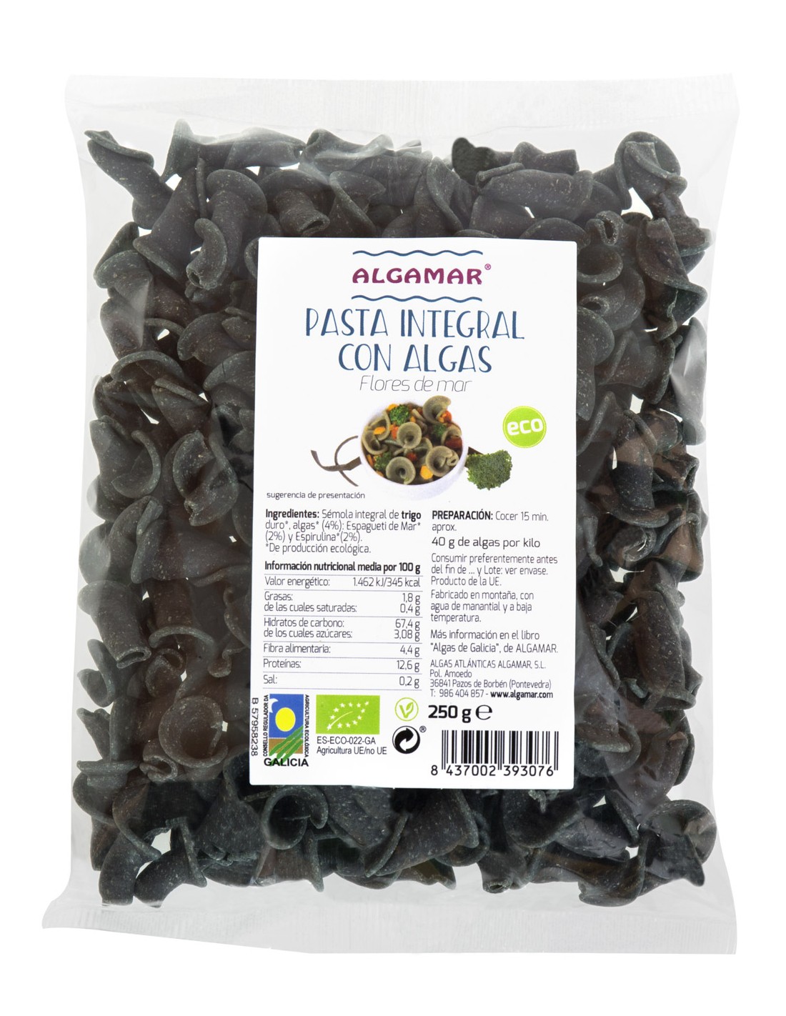 La Pasta Integral con Algas - Flores Mar de Algamar es una pasta saludable para consumidores conscientes, que aporta fibra y minerales marinos mediante la incorporación de algas naturales en su elaboración integral.