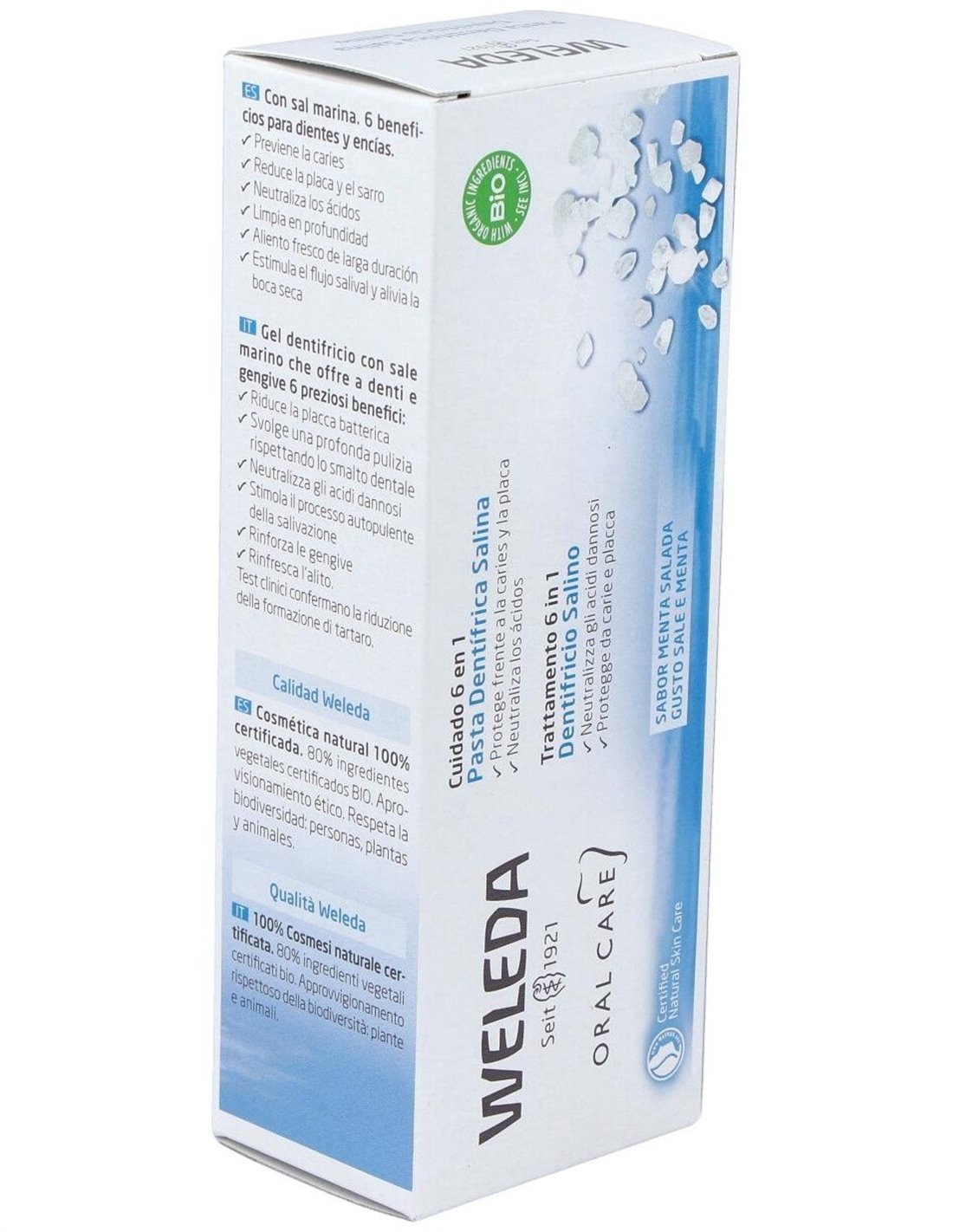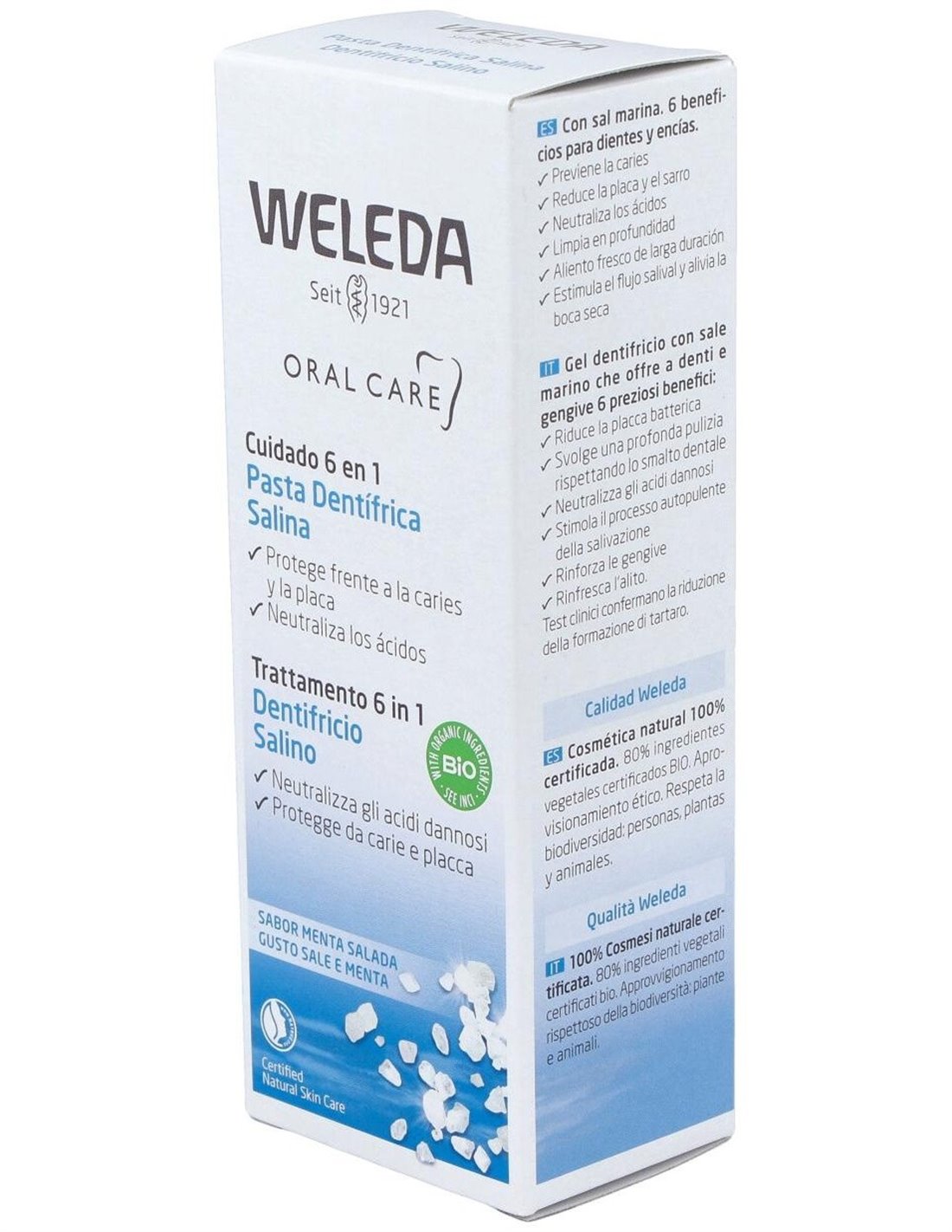 Con sal marina y bicarbonato sódico natural, este dentífrico neutraliza los ácidos nocivos responsables de la caries. Estudios comprueban su eficacia