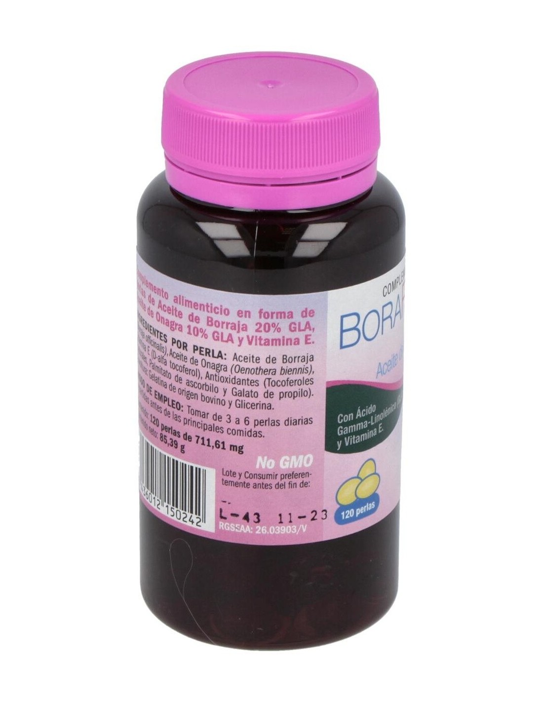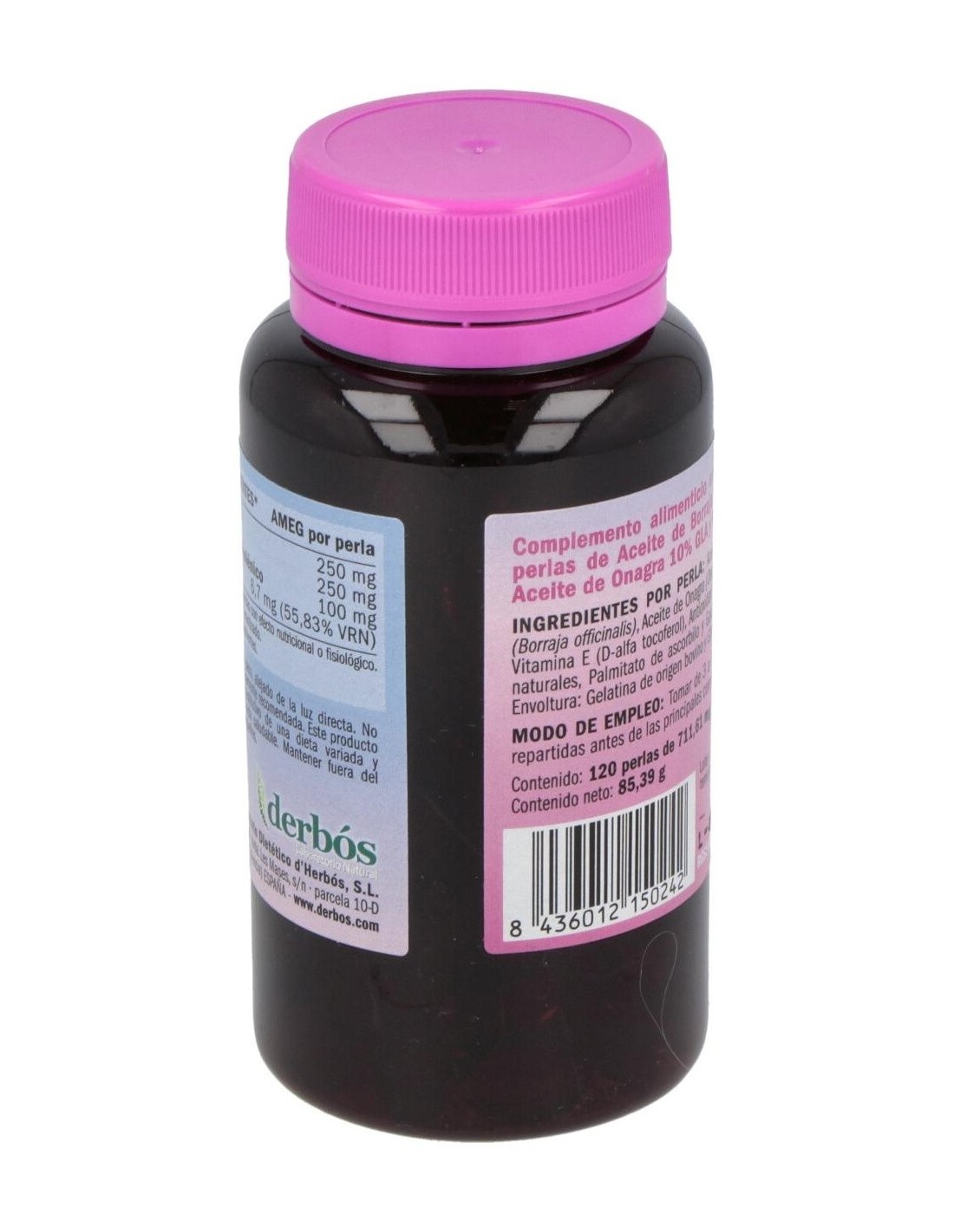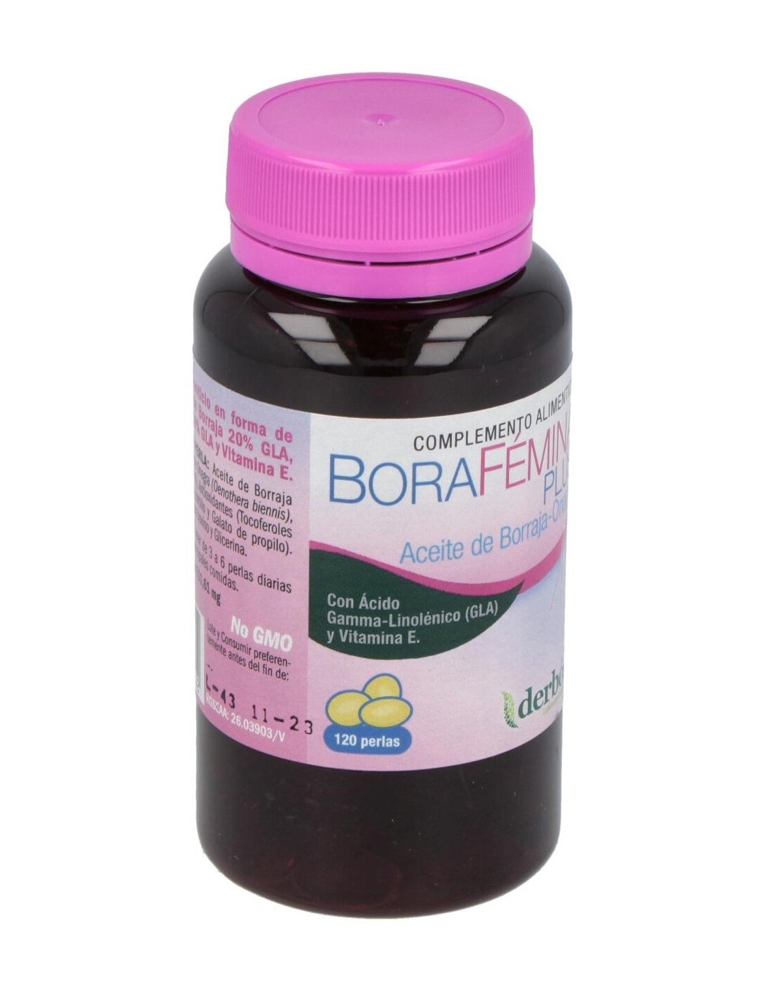 Derbós Borafémina Plus 120perlas es un complemento alimenticio en formato perlas que está enriquecido con aceite de borraja, de onagra y vitamina E. Ayuda a aliviar molestias derivadas de la menstruación o asociadas con la menopausia, como sofocos, hinchazón o malestar general.