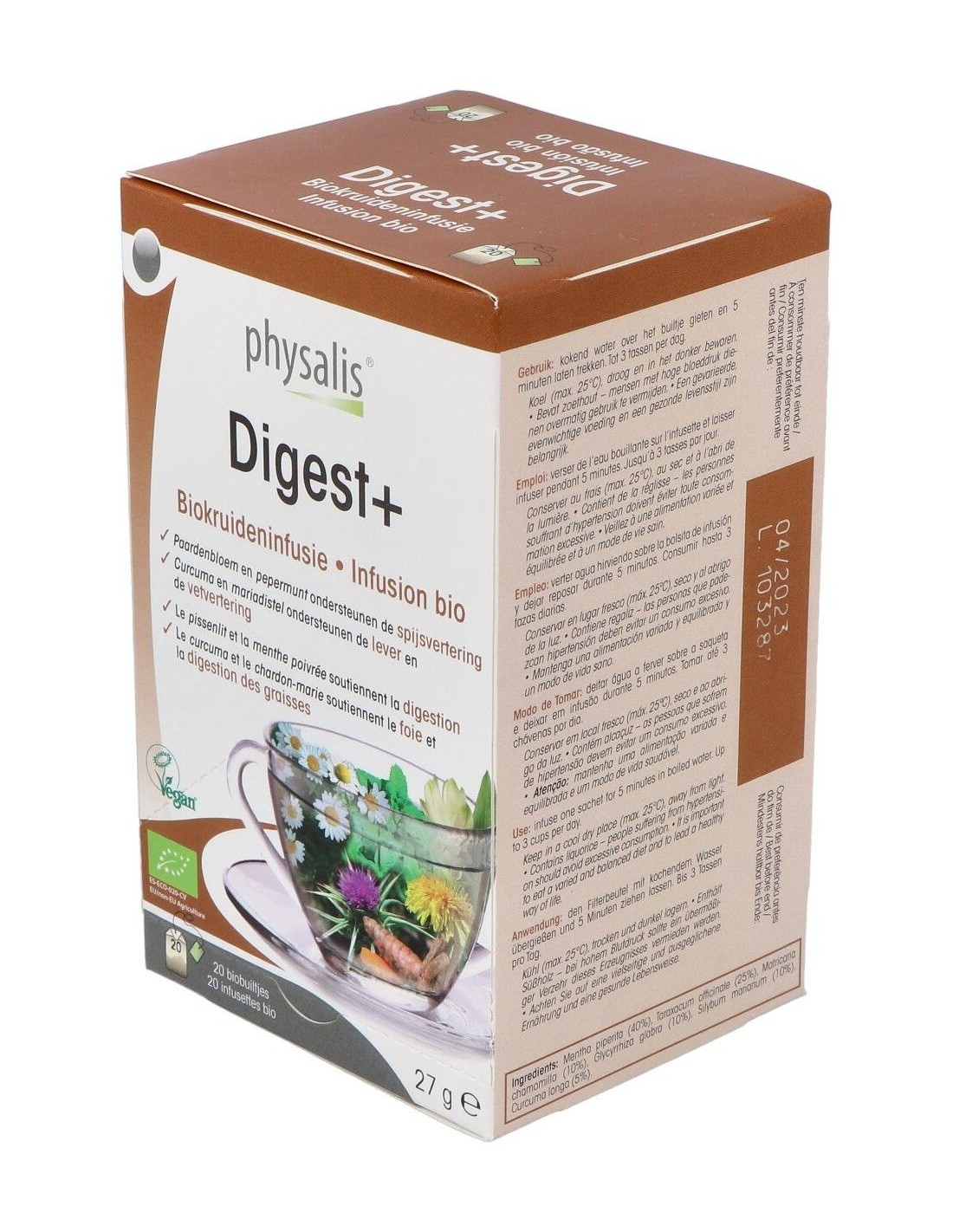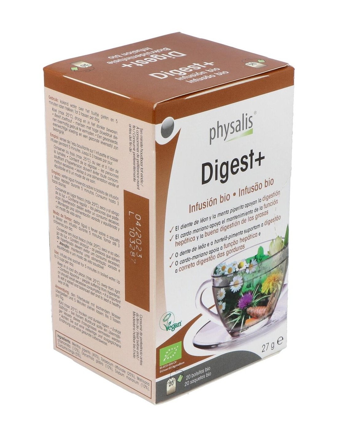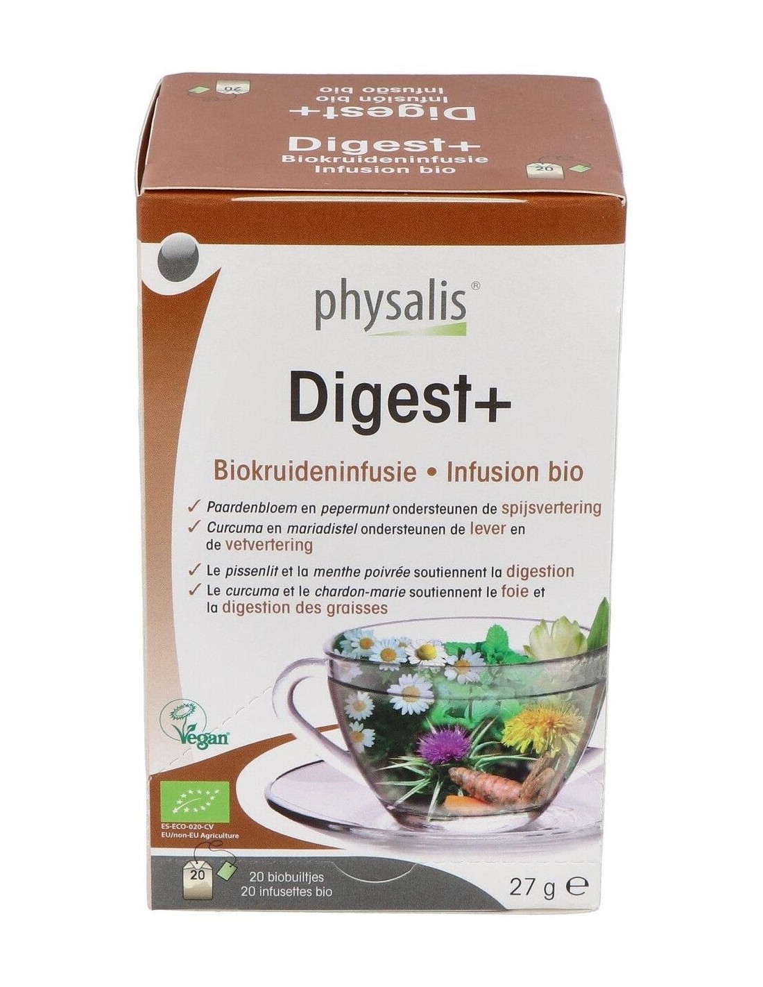 Infusión de plantas biológicas contiene diente de león, menta piperita y manzanilla que apoyan la digestión. La cúrcuma y el cardo mariano apoyan el mantenimiento de la función hepática y la buena digestión de las grasas.