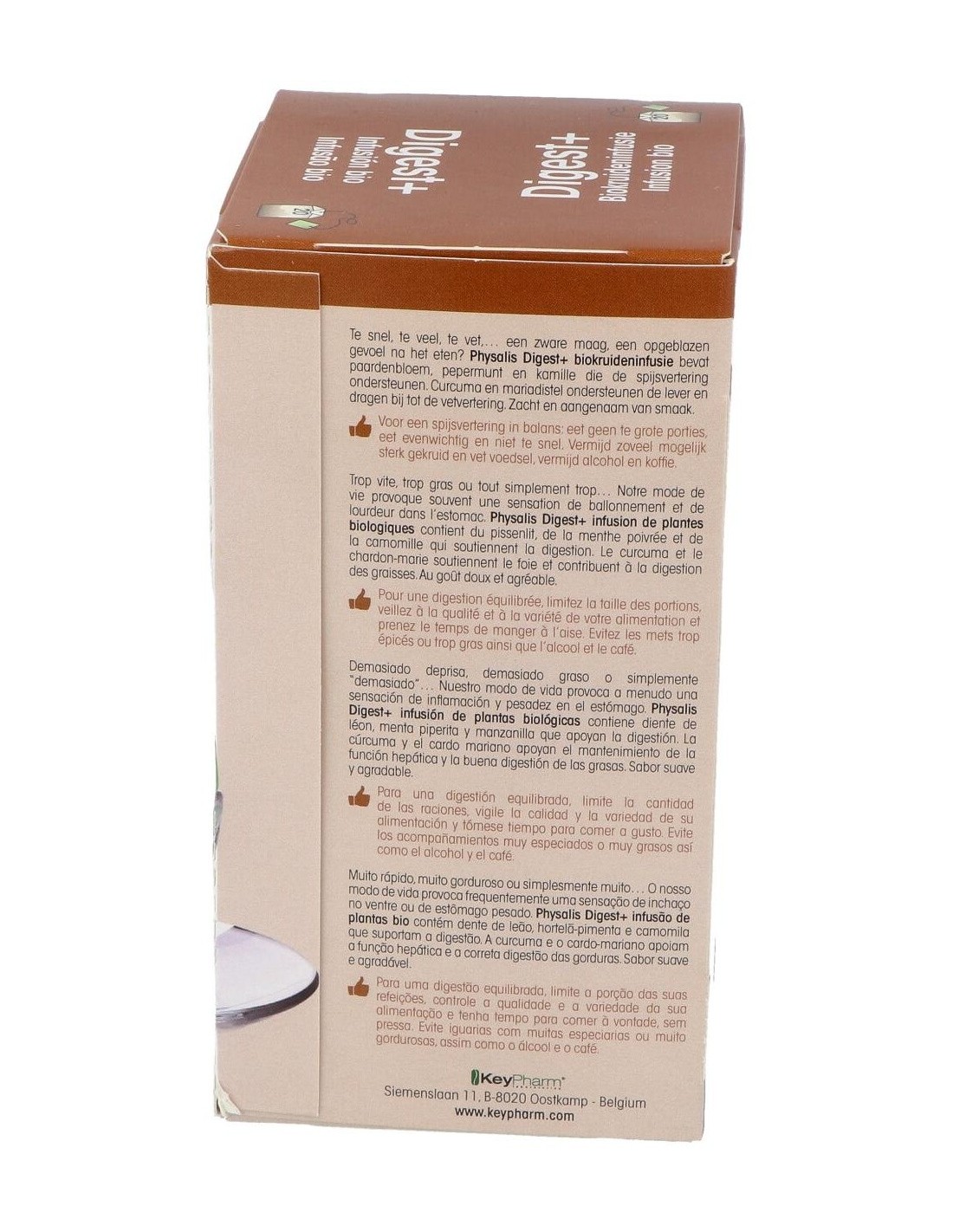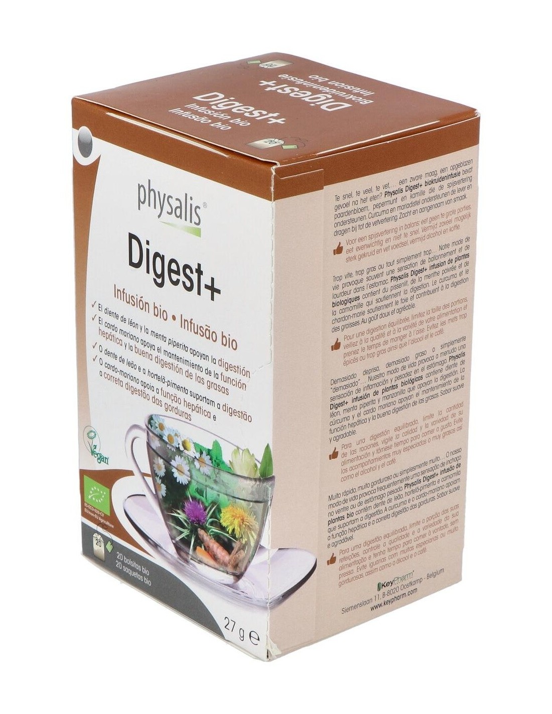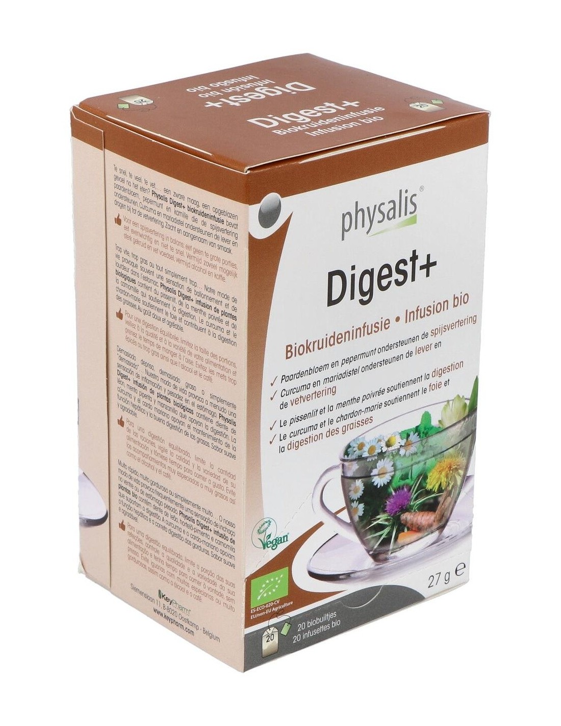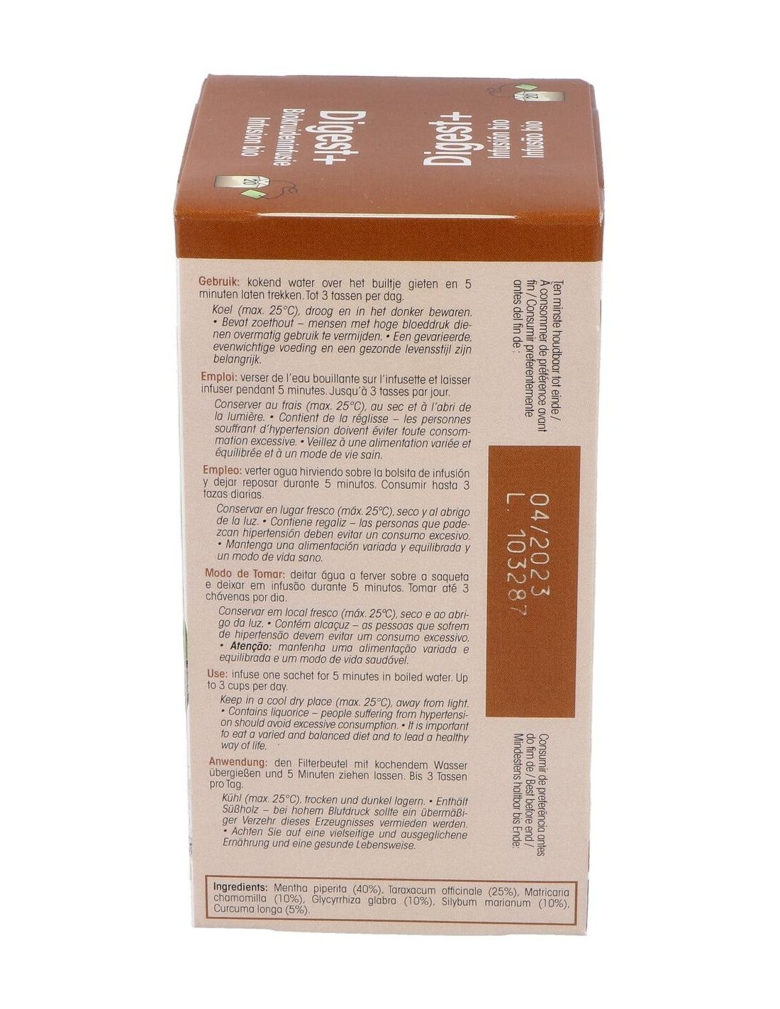 Infusión de plantas biológicas contiene diente de león, menta piperita y manzanilla que apoyan la digestión. La cúrcuma y el cardo mariano apoyan el mantenimiento de la función hepática y la buena digestión de las grasas.