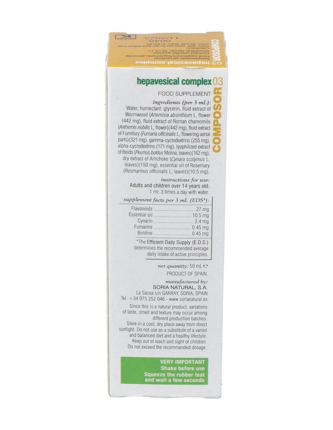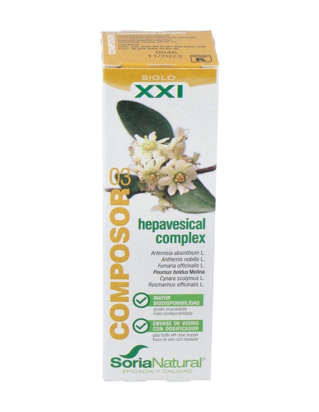 El Composor 03 Hepavesical Complex Xxi 50Ml. de Soria Natural es un complemento natural para personas que buscan apoyar la salud hepática y vesical, formulado con ingredientes que contribuyen al bienestar digestivo y urinario.