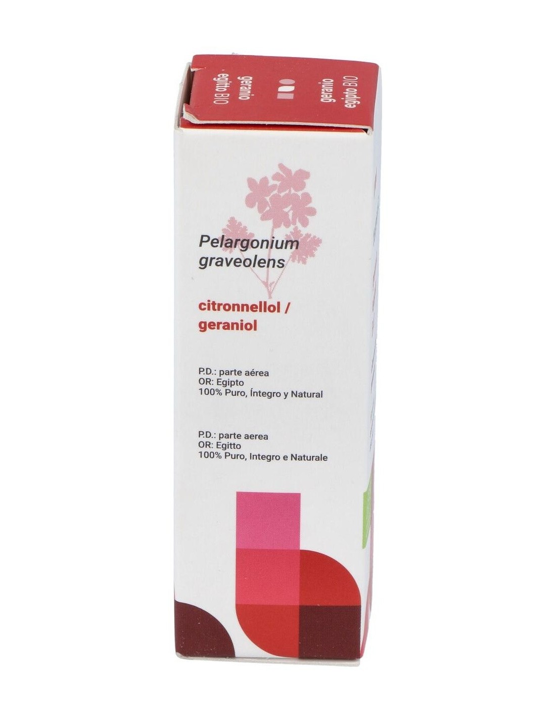 - Aceite esencial de geranio con certificación ecológica, adecuado para uso alimentario.