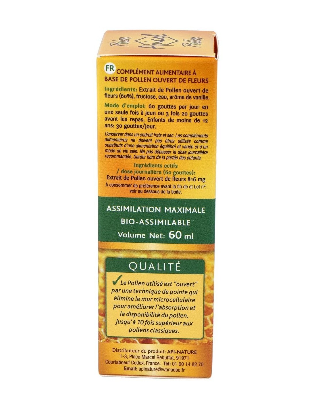 El producto está elaborado con ingredientes seleccionados para mantener las propiedades del polen en formato líquido, asegurando una textura homogénea y fácil absorción. Su diseño permite integrarlo fácilmente en la rutina diaria sin complicaciones.