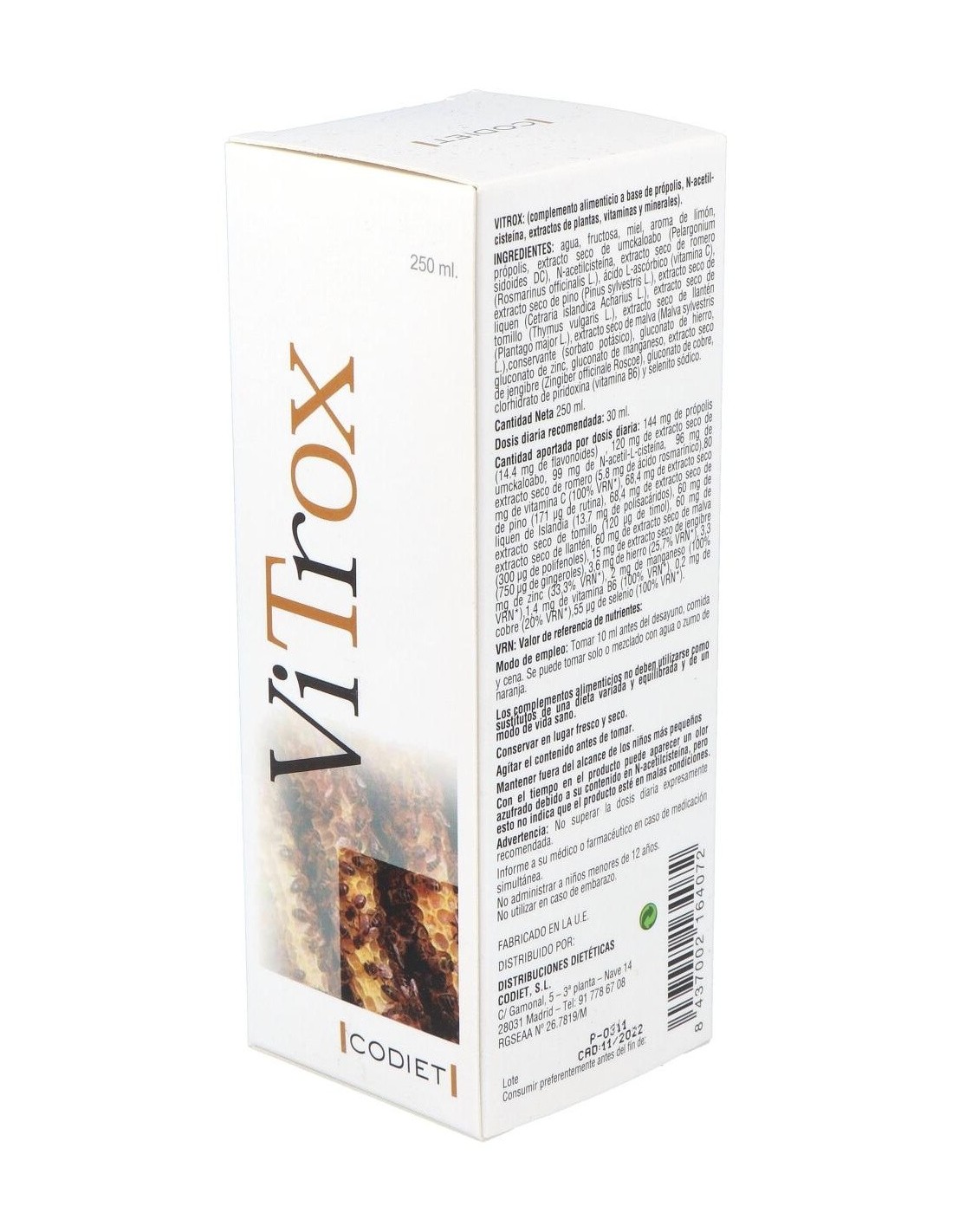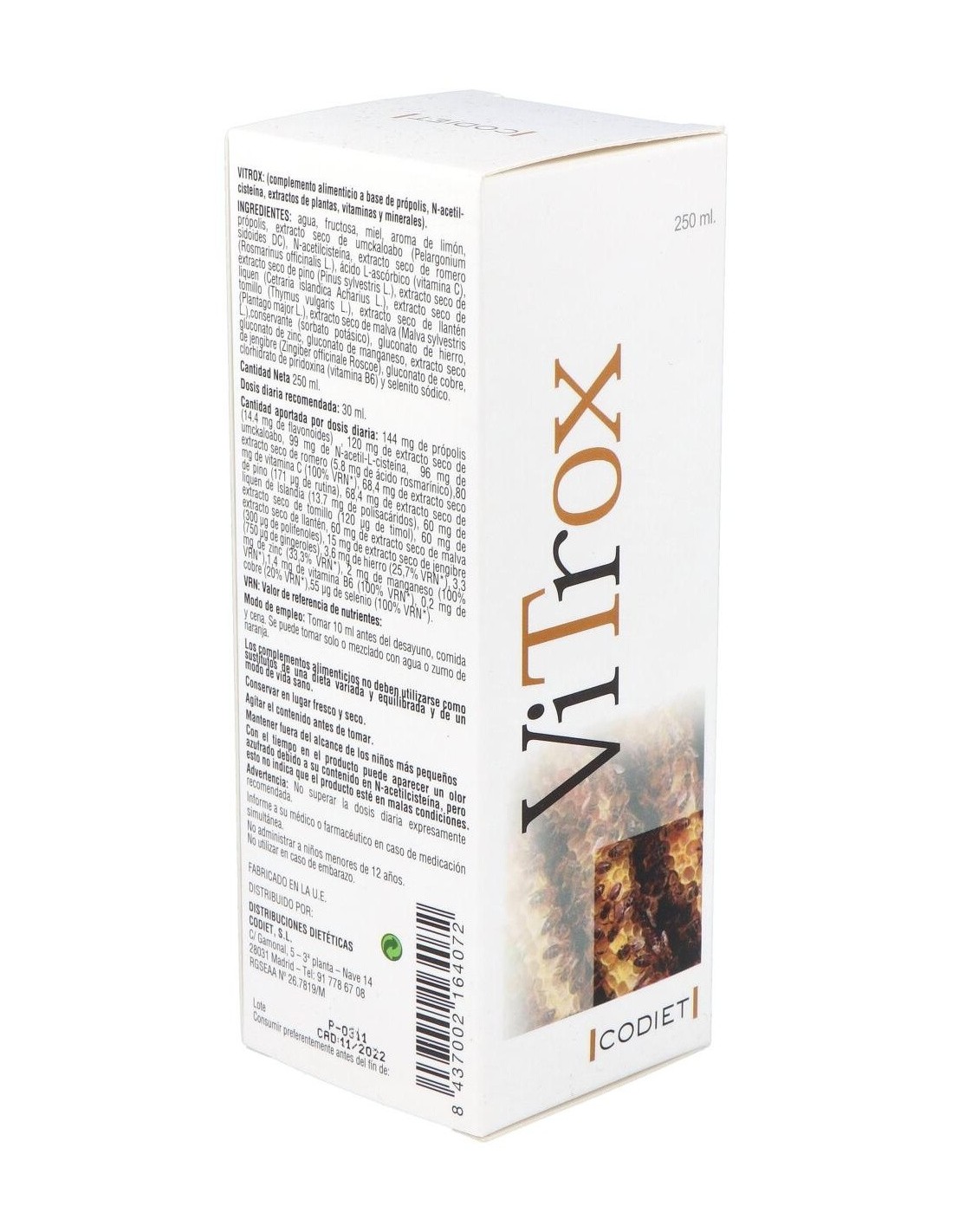 Agua: Miel: N- acetil cisteína: Extracto seco de Própolis: Extracto seco de Pelargonium Sidoides: Extracto seco de Drosera (Drosera rotundifolia): Extracto seco de Romero (Rosmarinus officinalis): Extracto seco de Pino (Pinus spp): Extracto seco de Liquen (Cetraria islándica Ach): Gluconato de Hierro: Vitamina C (ác. L ascórbico): Gluconato de Zinc: Extracto seco de Tomillo (Thymus vulgaris): Extracto seco de Llantén (Plantago spp): Extracto seco de Jengibre (Zingiber officinale Roscoe): Extracto seco de Malva (Malva sylvestris L): Gluconato de Manganeso: Gluconato de Cobre: Vitamina B6 (Piridoxina clorhidrato) y Selenio.