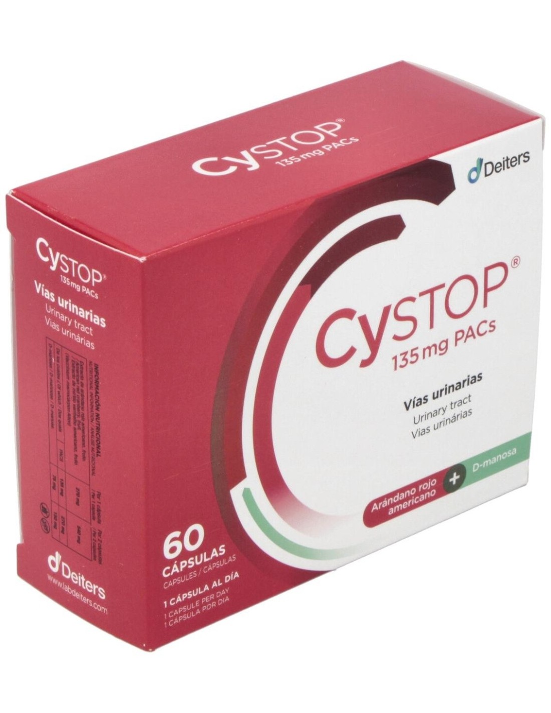 Cystop es un preparado alimenticio a base de arándano rojo americano y D-manosa, específicamente preparado para aportar a tu organismo propiedades que le ayudarán a inhibir la aparición de las molestias urinarias, prevenirlas y mejorar su bienestar tras su presencia. Gracias a su composición, Cystop permite bloquear los factores de adherencia de las bacterias en tu organismo, mejorando la protección y prevención de las molestias urinarias.