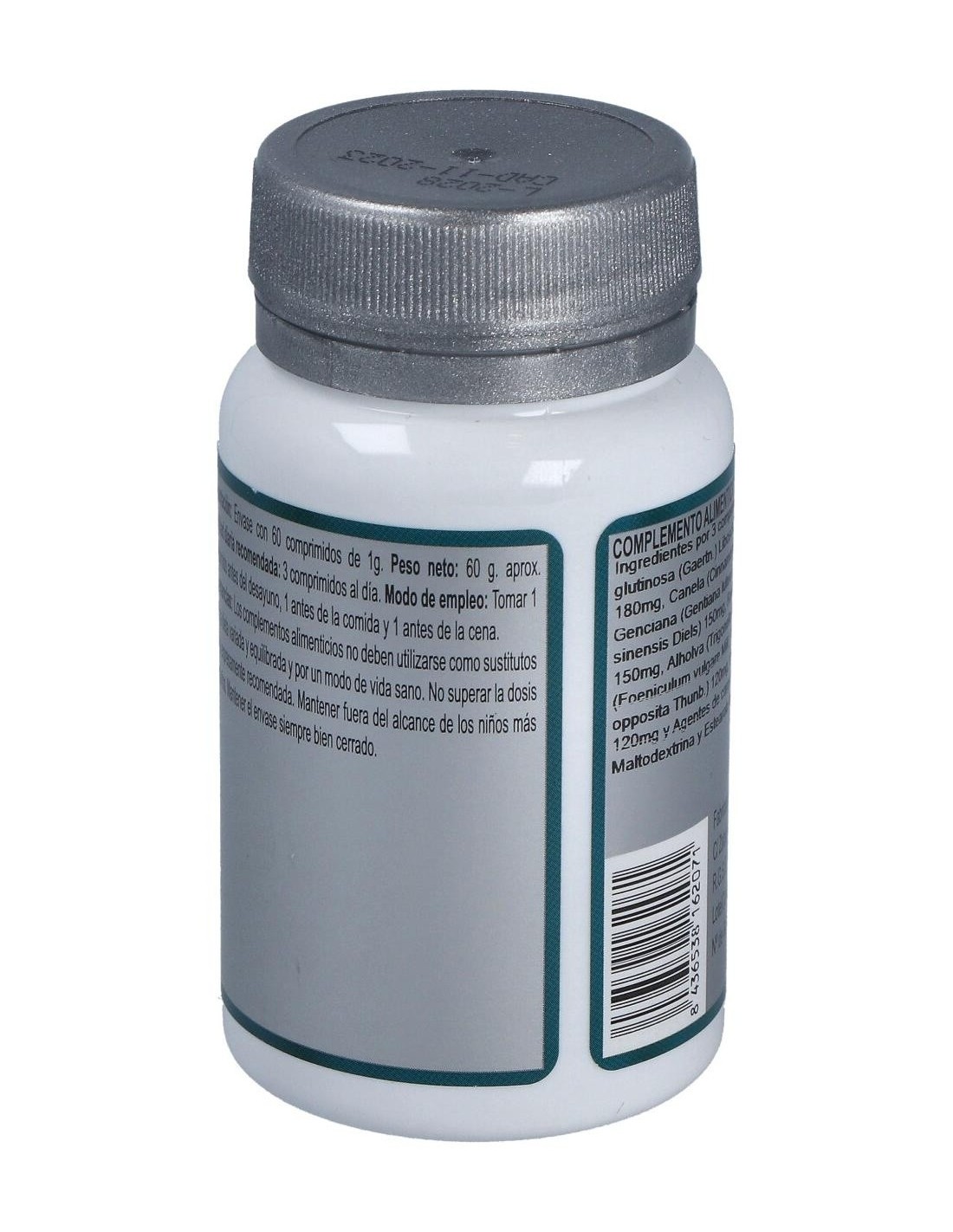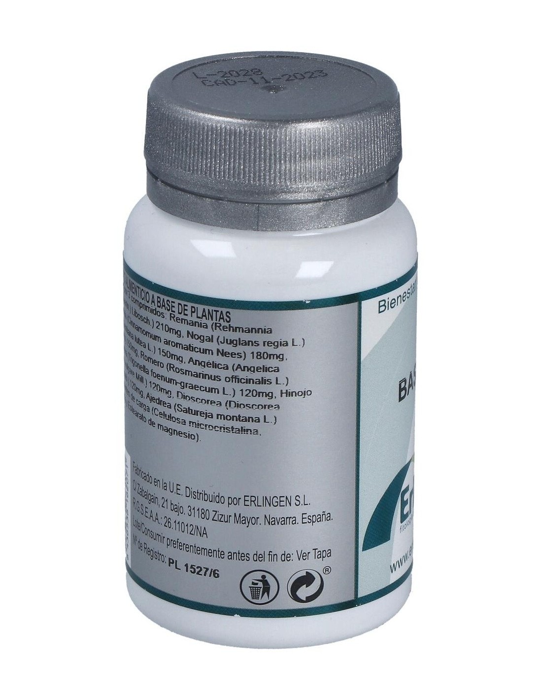 Remania (Rehmannia glutinosa (Gaertn.) Libosch.) 210 mg, Nogal (Juglans regia L.) 180 mg, Canela (Cinnamomum aromaticum Nees) 180 mg, Genciana (Gentiana lutea L.) 150 mg, Angélica (Angelica sinensis Diels) 150 mg, Romero (Rosmarinus officinalis L.) 150 mg, Alholva (Trigonella foenum-graecum L.) 120 mg, Hinojo (Foeniculum vulgare Mill.) 120 mg, Dioscorea (Dioscorea opposita Thunb.) 120 mg, Ajedrea (Satureja montana L.) 120 mg y Agentes de carga (Celulosa microcristalina, Maltodextrina y Estearato de magnesio).