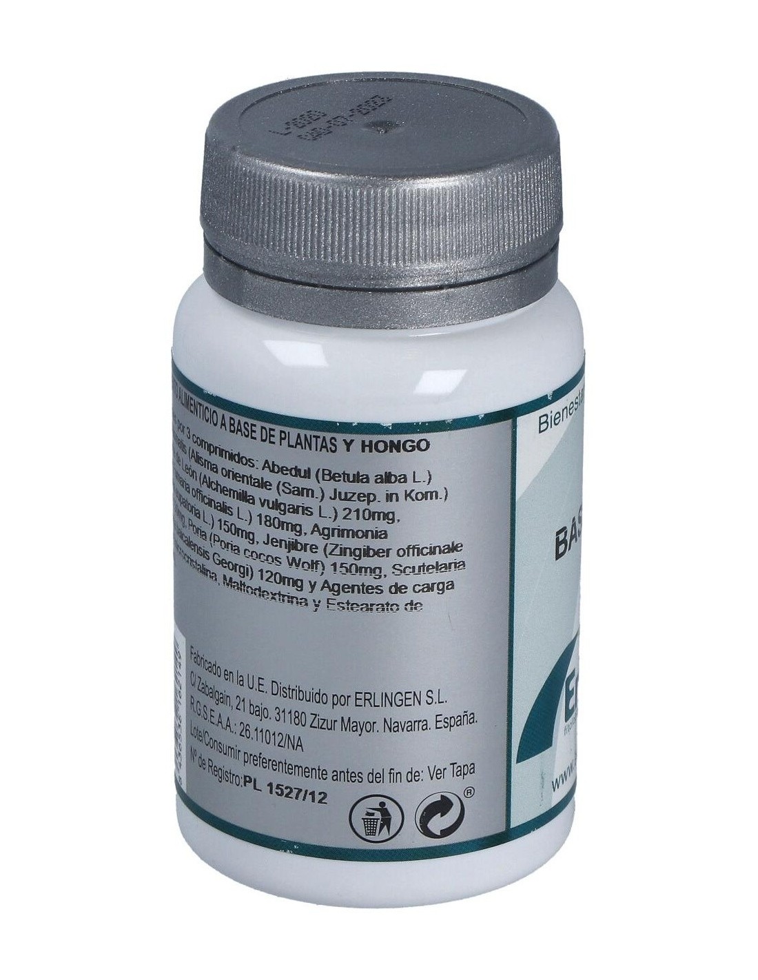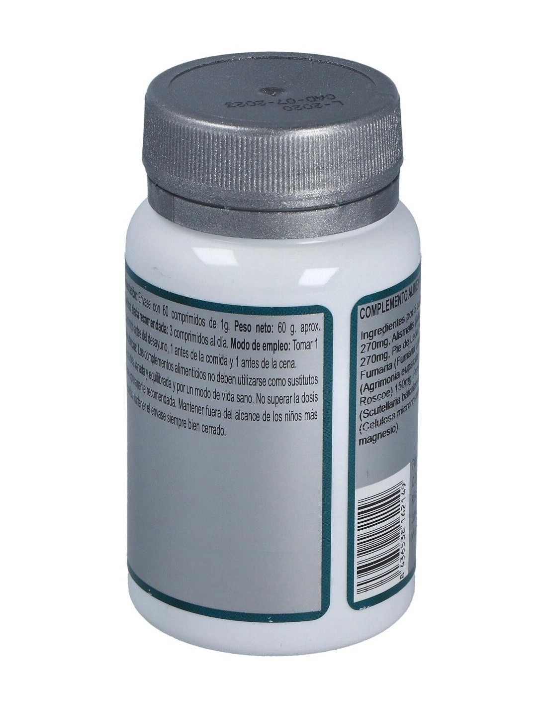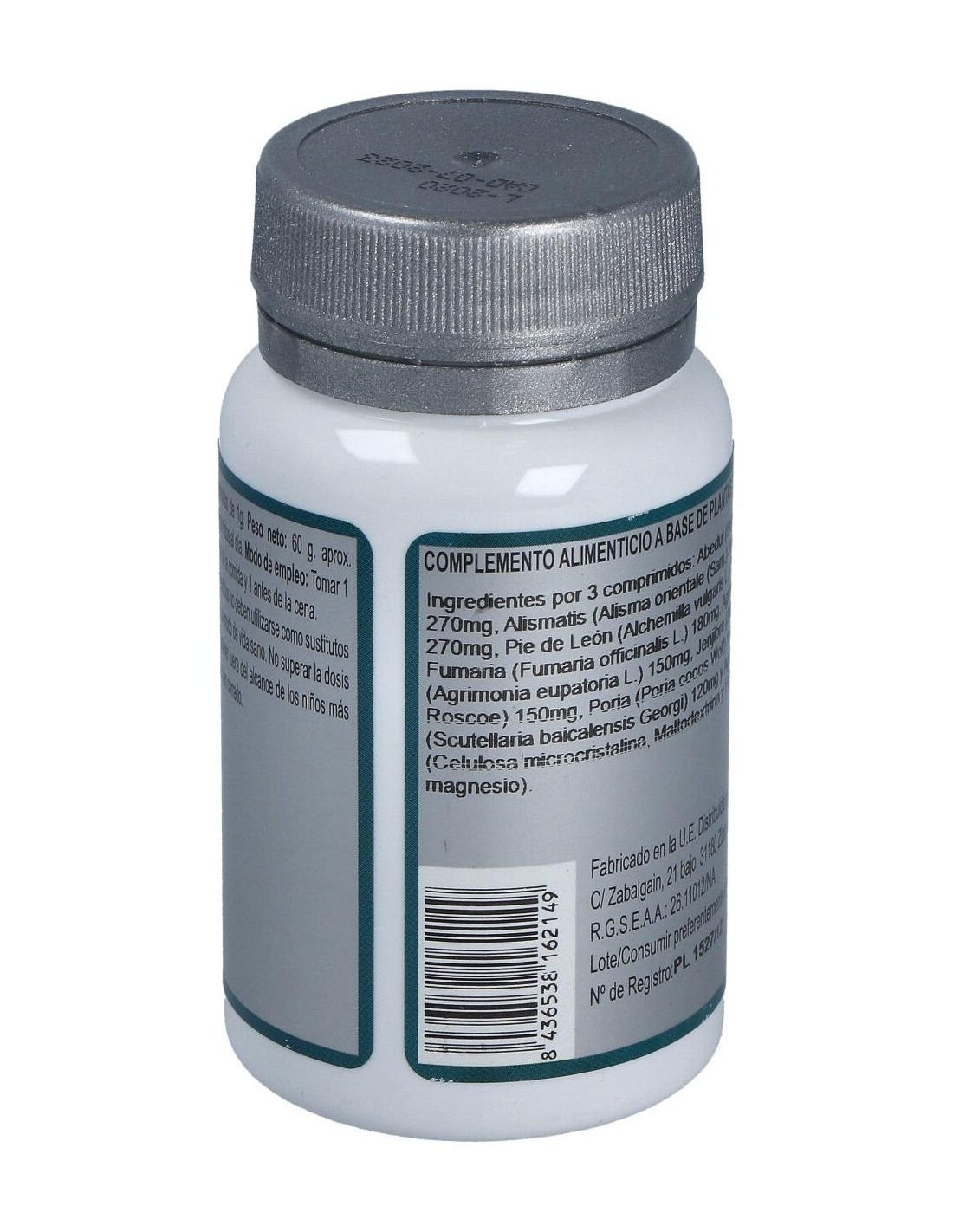 Abedul (Betula alba L.) 270 mg, Alismatis (Alisma orientale (Sam.) Juzep. in Kom.) 270 mg, Pie de León (Alchemilla vulgaris L.) 210mg, Fumaria (Fumaria officinalis L.) 18 0mg, Agrimonia (Agrimonia eupatoria L.) 150 mg, Jengibre (Zingiber officinale Roscoe) 150 mg, Poria (Poria cocos Wolf) 150 mg, Scutelaria (Scutellaria baicalensis Georgi) 120 mg y Agentes de carga (Celulosa microcristalina, Maltodextrina y Estearato de magnesio).
