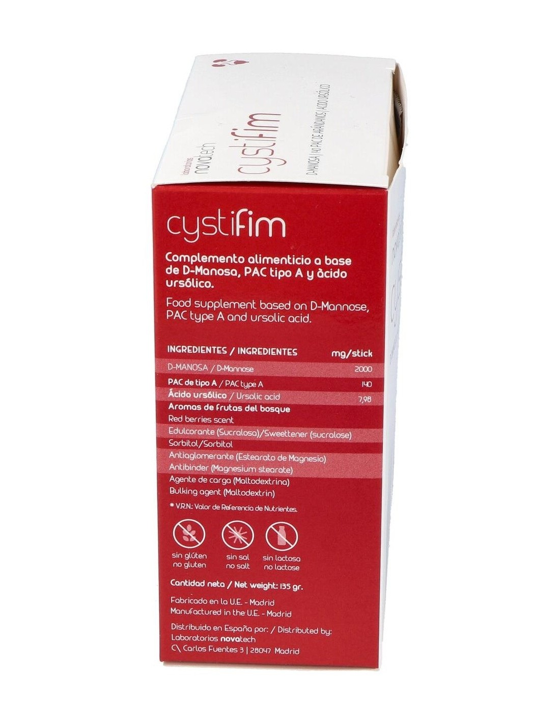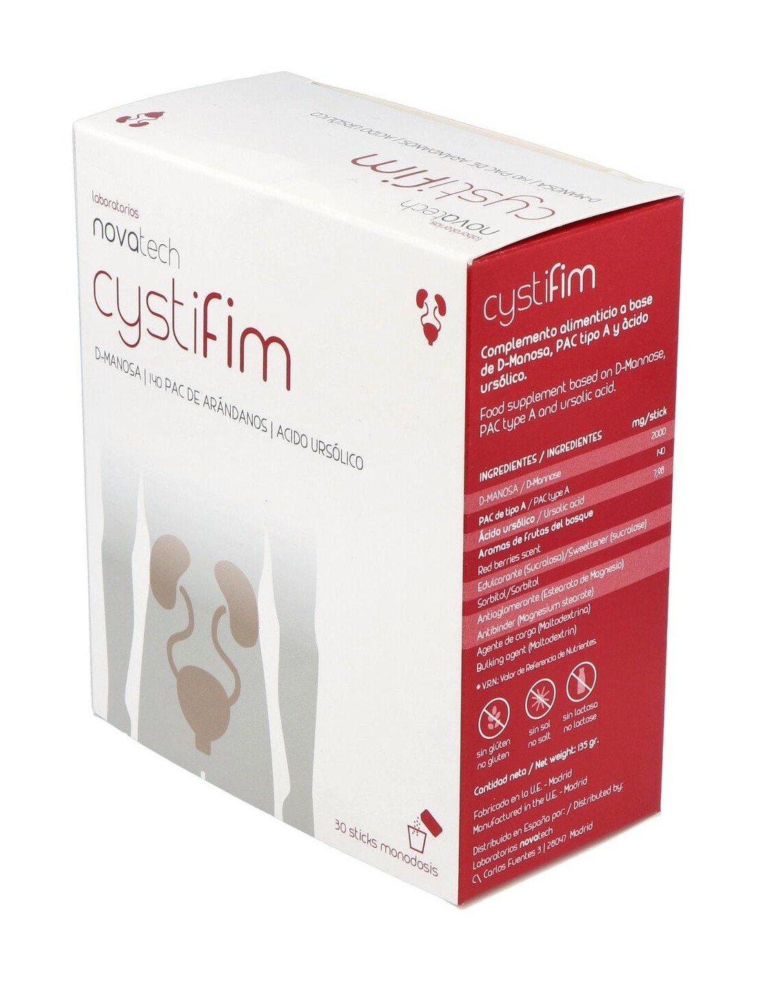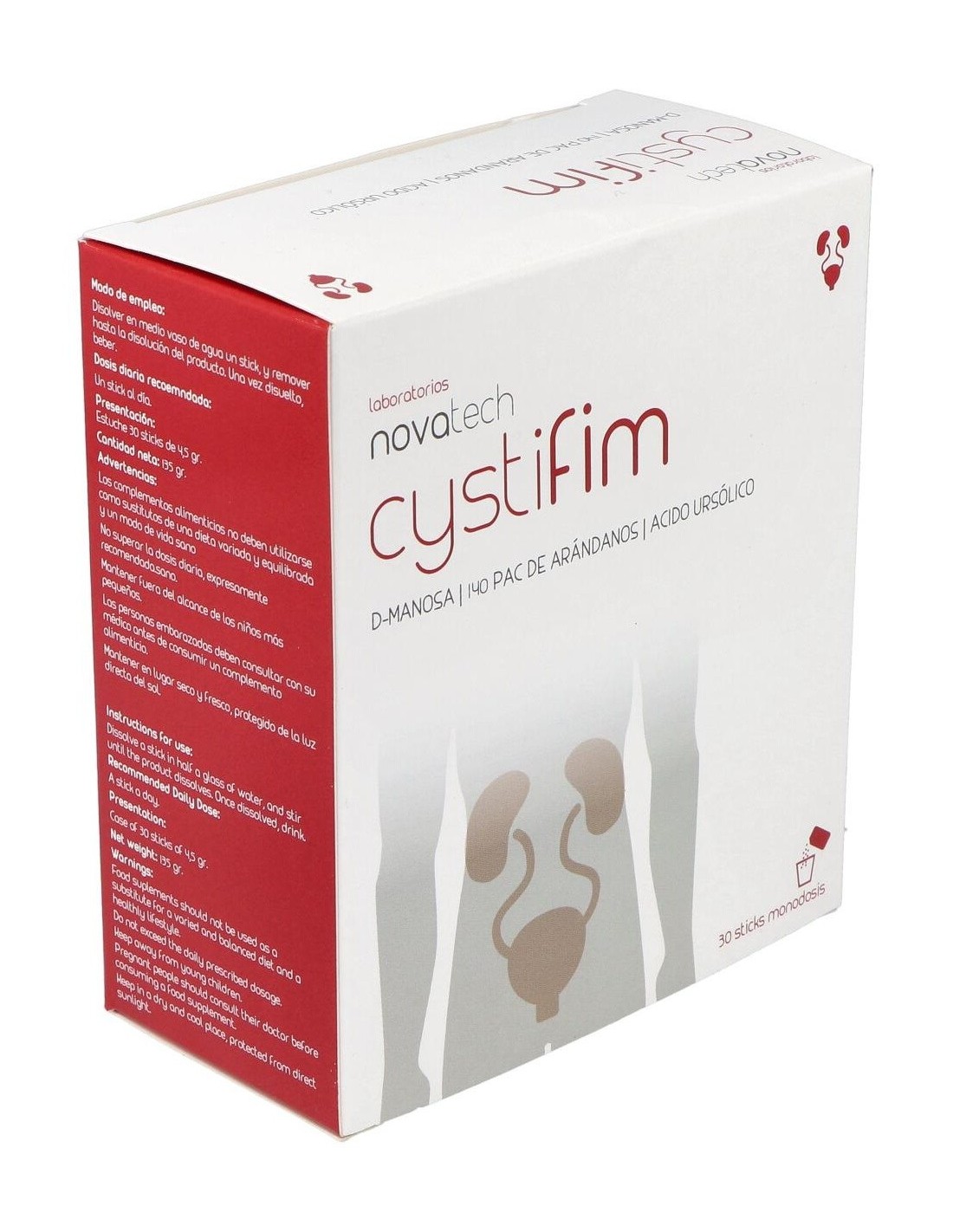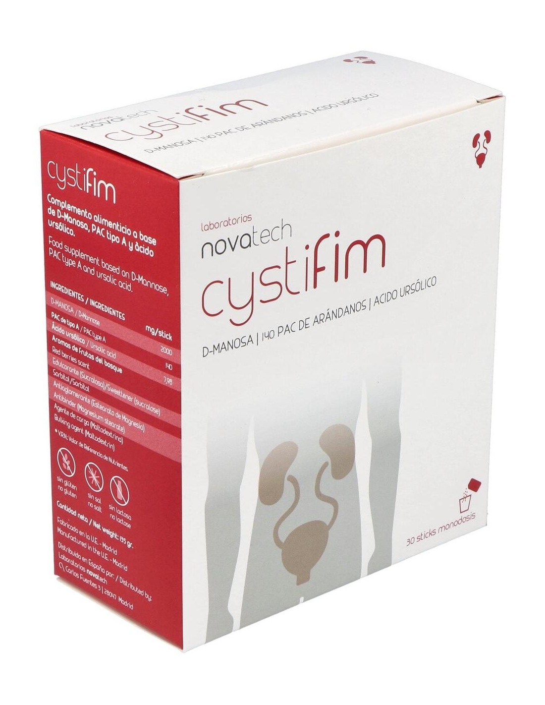 Complemento alimenticio fabricado por los laboratorios Novatech. Sobres con sabor a frutos rojos. Estos sobres tienen como objetivo hacer frente a los microorganismos causantes de las infecciones en el tracto urinario (ITU), contribuyendo a mejorar los síntomas y tratar la infección presente. Su composición de D-manosa, ácido ursólico y proantocianidinas interfiere tanto en infecciones presentes como en posibles reinfecciones. Este complemento está indicado para todo tipo de personas, especialmente mujeres, que sufren de frecuentes infecciones del tracto urinario (aproximadamente 3 o más infecciones durante el año). También favorece la prevención de reinfecciones en personas ya predispuestas a ellas. Se recomienda no exceder la dosis diaria. Este producto debe mantenerse fuera del alcance de niños y mascotas y almacenado en un lugar fresco, seco y protegido de la luz del sol.