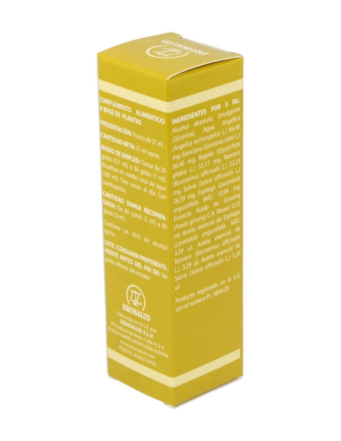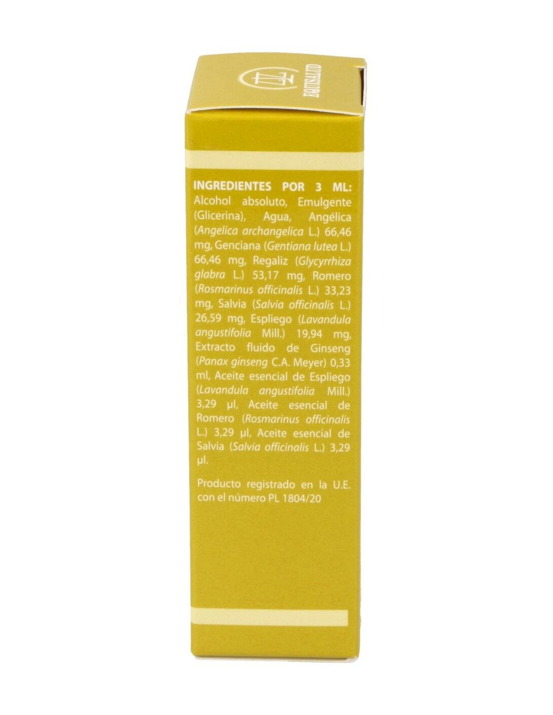 El QI es el resultado de la interacción de dos planos energéticos: alimentación y aire. Puede tener como origen todas las enfermedades crónicas, el estrés y los sobreesfuerzos, así como una deficiencia congénita, el desequilibrio alimentario, la vejez y los desarreglos fisiológicos de la energía QI y de la quintaesencia JING que le son propios. Manifestaciones asociadas a este síndrome: lengua pálida e hinchada (por vacío del bazo), pulso débil, respiración corta, malas digestiones, flatos, debilidad digestiva, astenia, sudoración espontánea, agotamiento al esforzarse, miembros débiles, voz débil, tendencia natural al reposo y con frecuencia vértigos y trastornos de la vista. Composición:Angélica (Angelica archangelica), Espliego (Lavandula angustifolia), Genciana (Gentiana lutea), Regaliz (Glycyrrhiza glabra), Romero (Rosmarinus officinalis), Salvia (Salvia officinalis), Ginseng (Panax ginseng). Modo de empleo:Tomar de 20 a 30 gotas disueltas en medio vaso de agua, 3 veces al día. Presentación:Frasco de 31 ml.