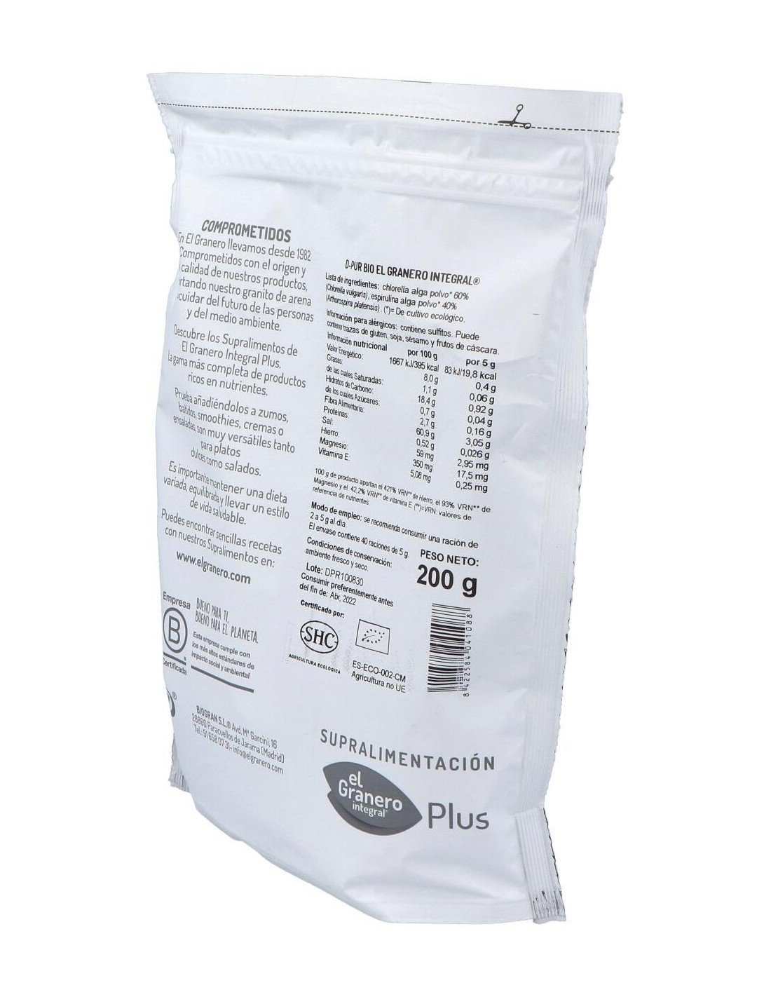 Ingredientes:Chlorella alga en polvo* 60% (Cholerella vulgaris), espirulina alga en polvo* 40% (Espirulina platensis). (*) De agricultura ecológica.Modo de empleo:Prueba añadiéndoloes a zumos, batidos, smoothies, cremas o ensaladas, son muy versátiles tanto para platos dulces como salados. Se recomienda consumir una ración de 20 gramos (una cucharada) al día. Presentación:Bolsa de 200 gramos.Recomendaciones y advertencias:Contiene sulfitos. Puede contener trazas de gluten, sésamo, soja y frutos de cáscara.