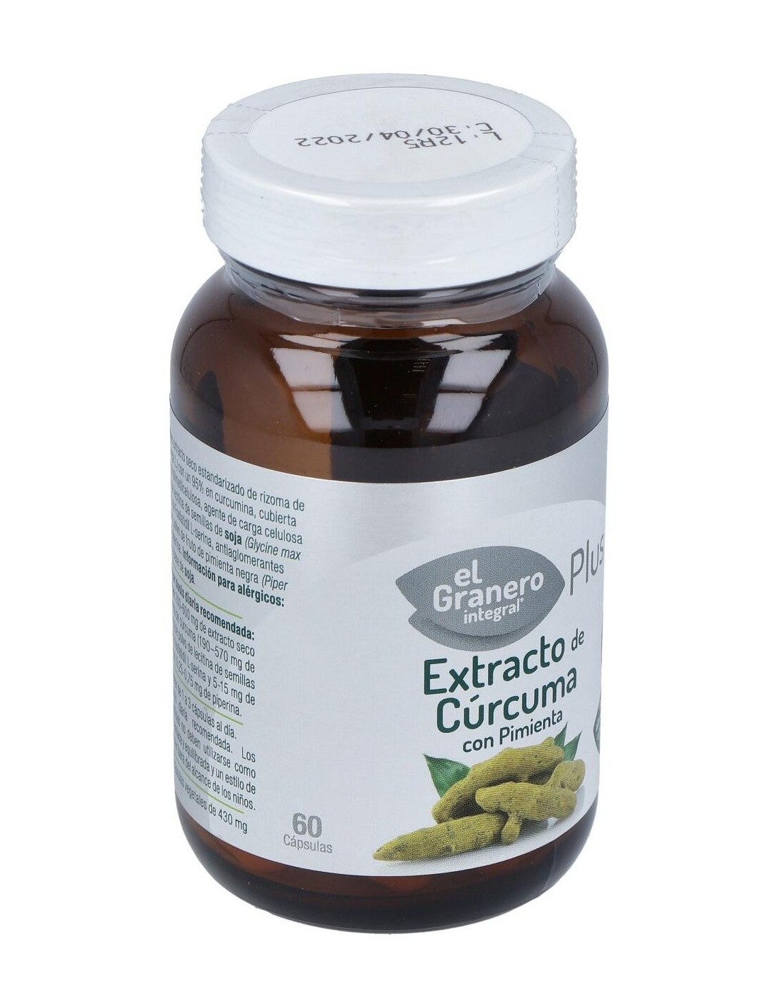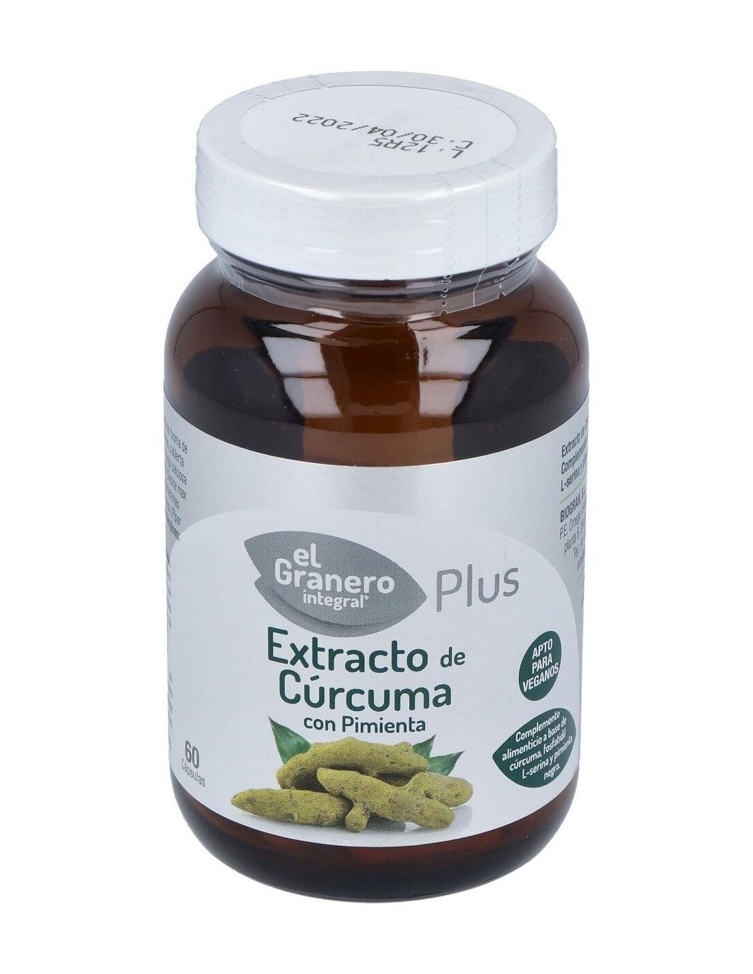 Ingredientes:Extracto seco estandarizado de rizoma de cúrcuma (Cúrcuma Longa L.) con un 95% en curcumina, cubierta de la capsula: hidroxipropilmetilcelulosa, agente de carga celulosa microcristalina, polvo de lecitina de semillas de soja (Glycine max (L.) Merr.) con un 20% de Fosfatidil L-serina, antiaglomerantes estearato de Magnesio, polvo de fruto de pimienta negra (Piper nigrus) con un 5% en piperina. Modo de empleo:Tomar 2 cápsulas al día. Presentación:Envase de 60 perlas.Recomendaciones y advertencias:Apto para veganos.