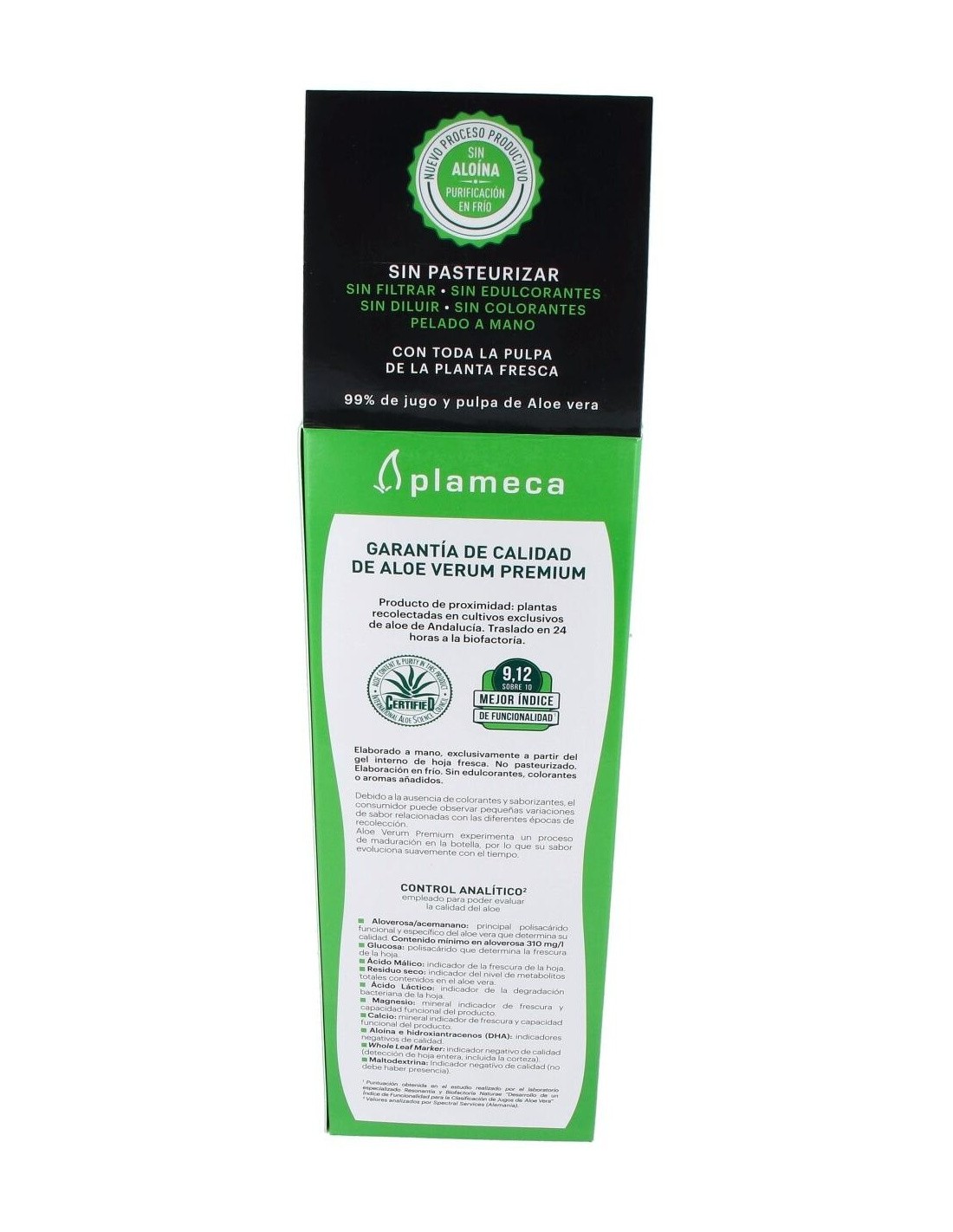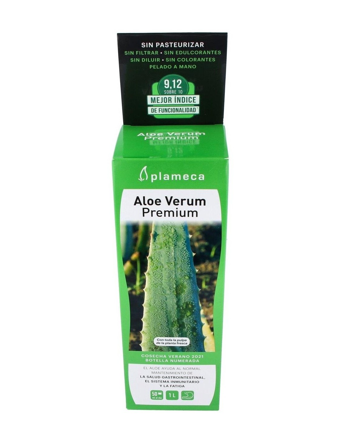 2. Análisis por Spectral Services (Alemania). Debido a la ausencia de colorantes y saborizantes, el consumidor puede observar pequeñas variaciones de sabor relacionadas con las diferentes épocas de recolección. Aloe verum premium experimenta un proceso de maduración en la botella, por lo que su sabor evoluciona suavemene con el tiempo. Ingredientes:Jugo y pulpa de Aloe vera var. barbadensis Miller 99%, acidulante (ácido cítrico), conservadores (sorbato potásico, benzoato sódico).Modo de empleo:Tomar 50 ml por la mañana, antes del desayuno, para un efecto general sobre el organismo. O bien, para potenciar su efecto digestivo, tomar 25 ml antes de las principales comidas.Presentación:Botella de 1 litro.Recomendación y advertencias:No contiene gluten ni lactosa.