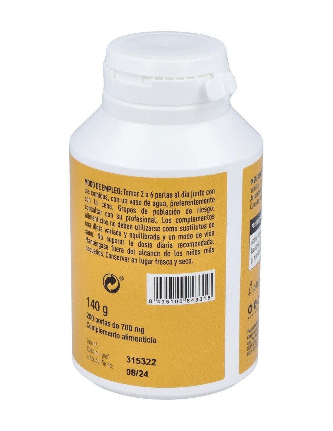 Modo de empleo:Tomar de 2 a 6 perlas al día junto con las comidas.Presentación:Envase de 200 perlas.