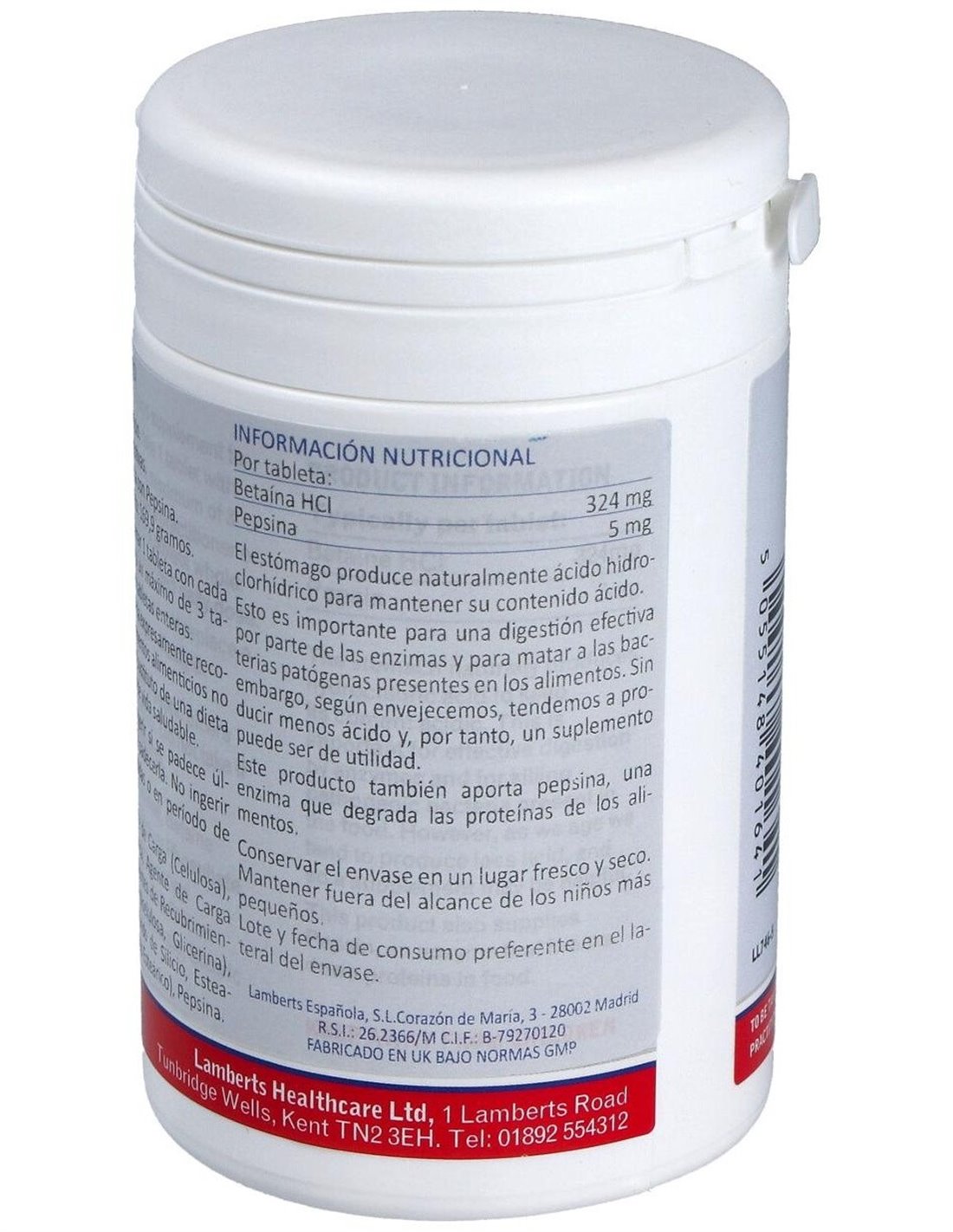 Betaína HCl 324 mg y Pepsina 5 mg 180 Tabs. de Lamberts