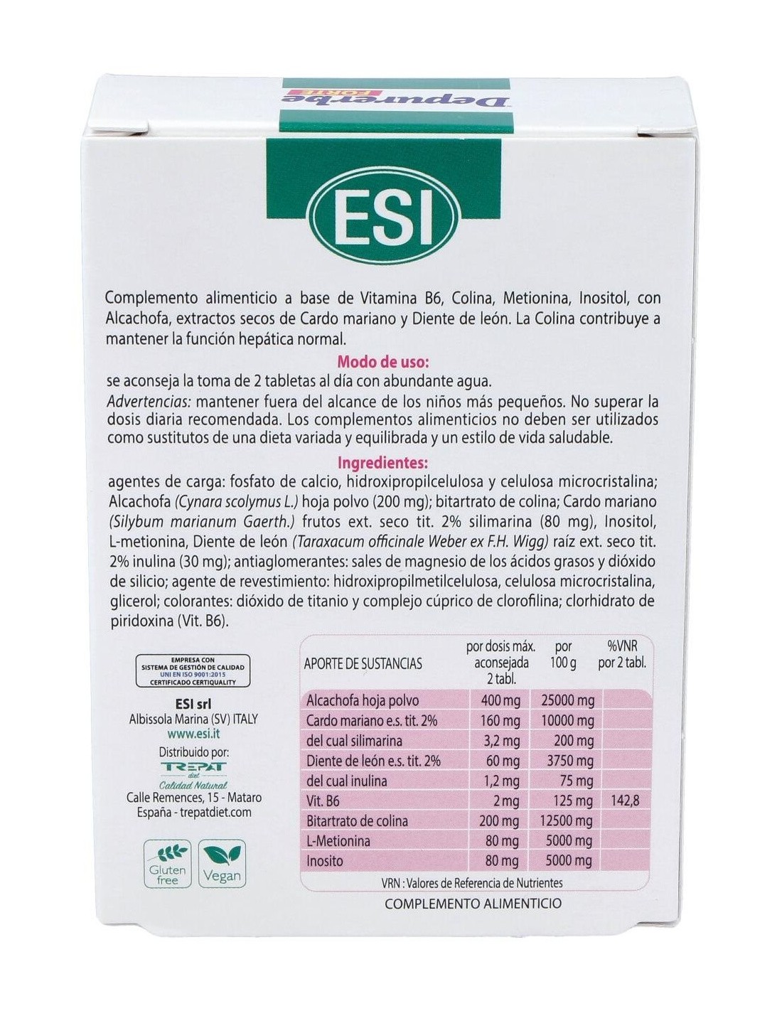 Producto herborístico a base de extractos vegetales depurativos y desintoxicantes, ayuda al organismo en la eliminación de las toxinas y mantiene limpio el hígado y los riñones de forma natural. Cuando deseamos ayudar al organismo a eliminar toxinas, cuando el cansancio y agotamiento no nos permiten estar en forma, cuando nos excedemos al comer y tenemos el hígado fatigado, cuando deseamos recuperar una natural forma física y un mejor aspecto de la piel. Composición por dosis diaria recomendada (2 comprimidos):