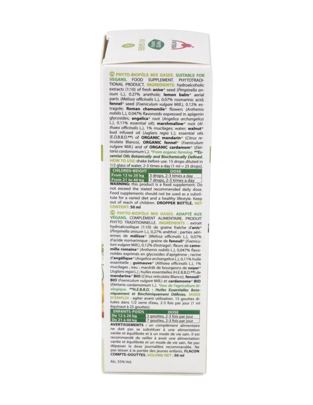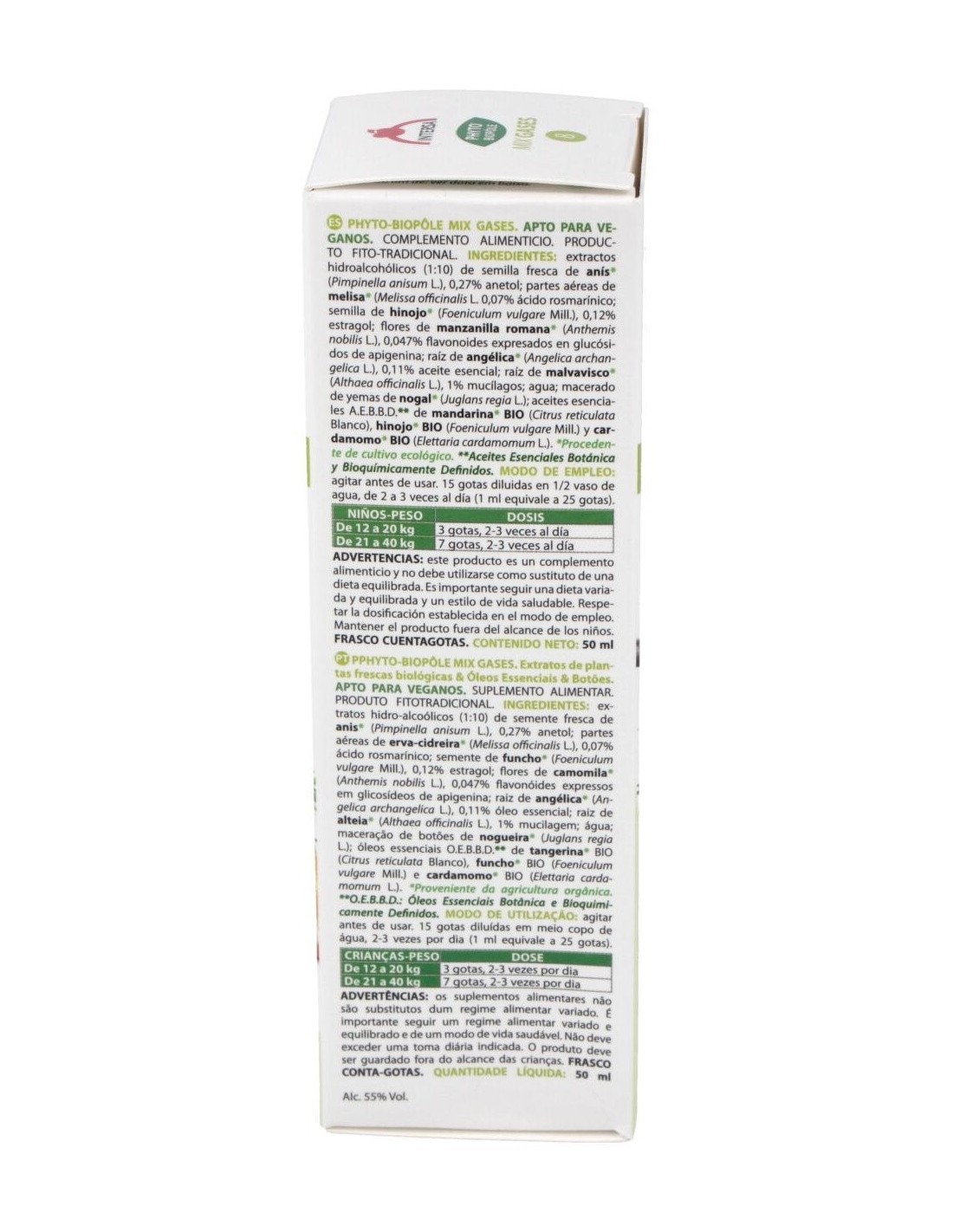 Mix Pec es un producto natural perteneciente a la linea Phyto Biopole, que aporta una excelente combinación de extractos combinados de plantas, yemas y aceites esenciales que colaboran en la eliminacion de gases evitando la sensacion de hinchazon del vientre.Ingredientes:Extractos hidroalcohólicos (1:10) de planta fresca de: semilla de anís* (Pimpinella anisum L. 0,27% anetol), partes aéreas de melisa* (Melissa officinalis L. 0,07% ácido rosmarínico) y semilla de hinojo* (Foeniculum vulgare Mill 0,12% estragol). Extracto hidroalcohólico (1:10) de: flores de manzanilla romana* (Anthemis nobilis L., 0,047% flavonoides expresados en glucósidos de apigenina), raíz de angélica* (Angelica archangelica L., 0,11% aceite esencial) y raíz de malvavisco* (Althaea officinalis L., 1% mucílagos). Macerado de yemas de nogal* (Juglans regia L.). Aceites esenciales A.E.B.B.D.** de: mandarina* BIO (Citrus reticulata Blanco), hinojo* BIO (Foeniculum vulgare Mill) y de cardamomo* BIO (Elettaria cardamomum L).* Procedente de cultivo ecológico.