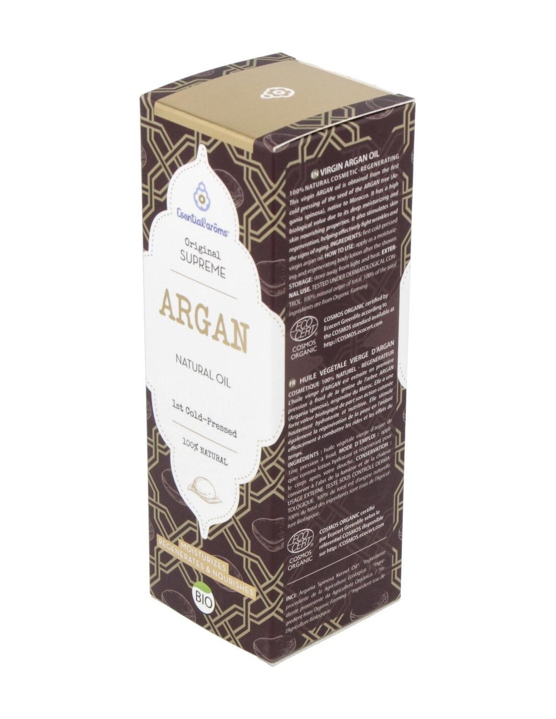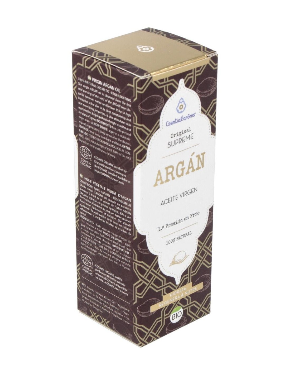 Es originario de marruecos, procedente de la agricultura ecológica, posee un elevado valor biológico, por su acción altamente hidratante y nutritiva cutánea. Además, gracias a su acción antiradicales libres y regeneradora celular, ayuda de manera eficaz a disminuir la profundidad de las arrugas y el paso del tiempo. Su elevado contenido en ácidos grasos esenciales (3 veces superior al aceite de oliva), vitamina E natural y fitoesteroles, dotan a este aceite vegetal virgen de unas propiedades únicas a nivel cosmético y dermatológico. El aceite de argán es altamente hidratante y nutritivo, regenerador celular y antioxidante. Está recomendado en cuidado especial de la piel seca, muy seca, descamada, prevención de la aparición de las arrugas del rostro.