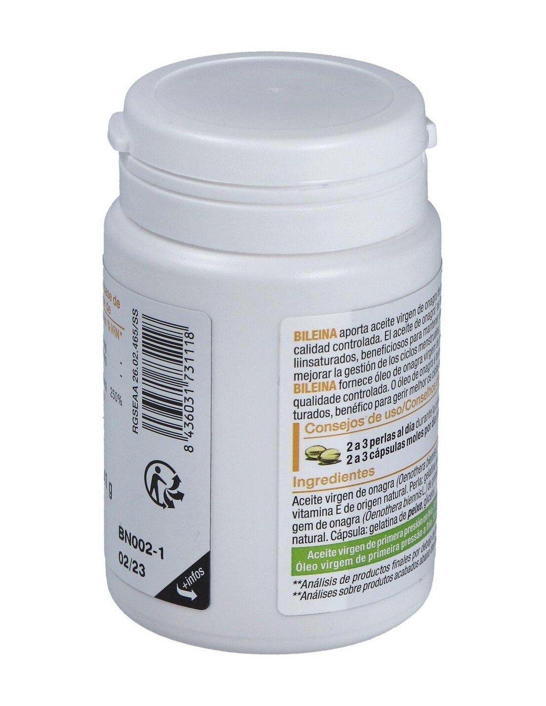 Aceite virgen de onagra (Oenothera biennis L.) de primera presión en frío, vitamina E de origen natural. Perla: Gelatina de pescado, glicerol.