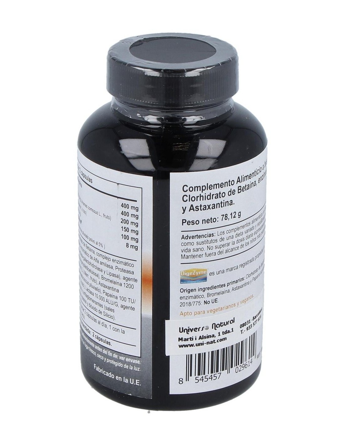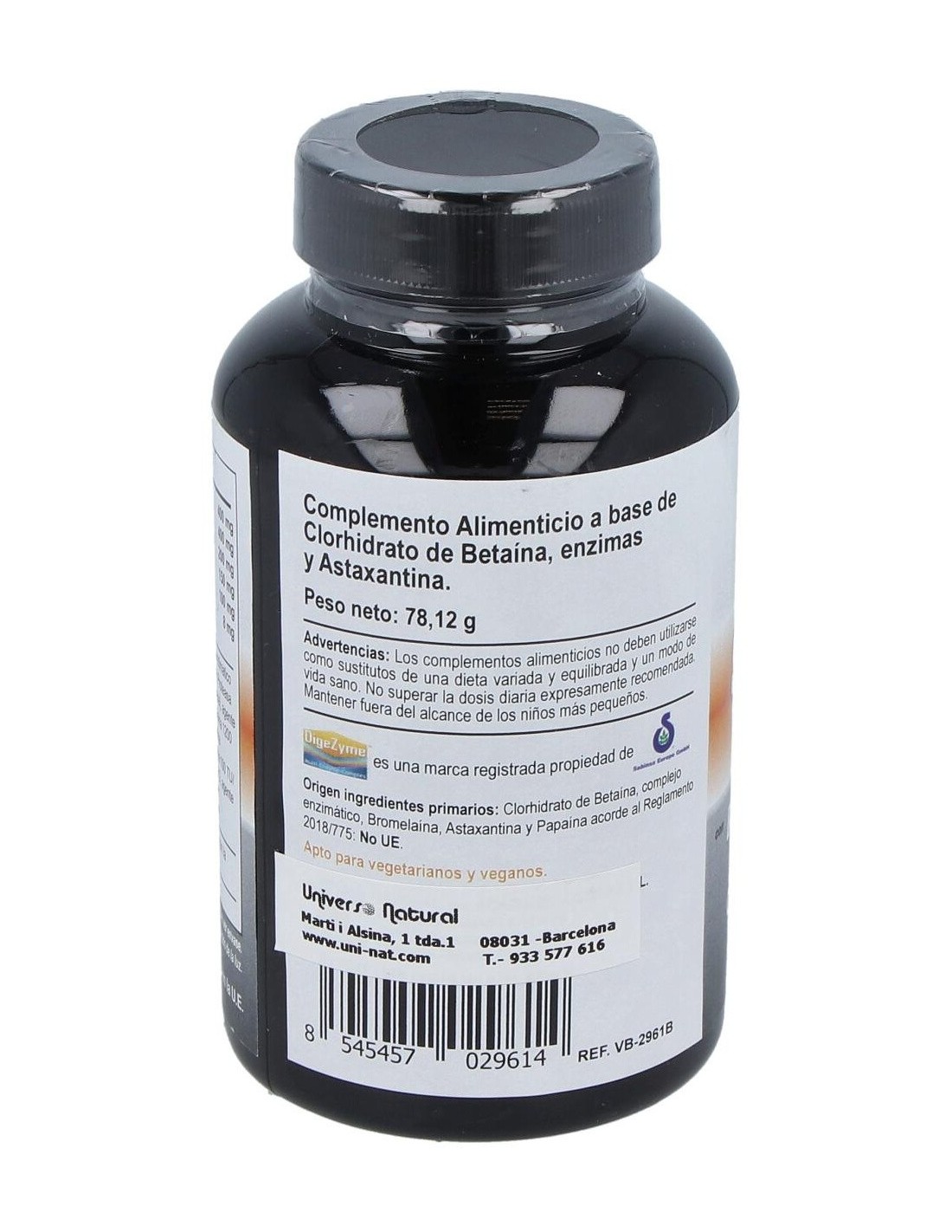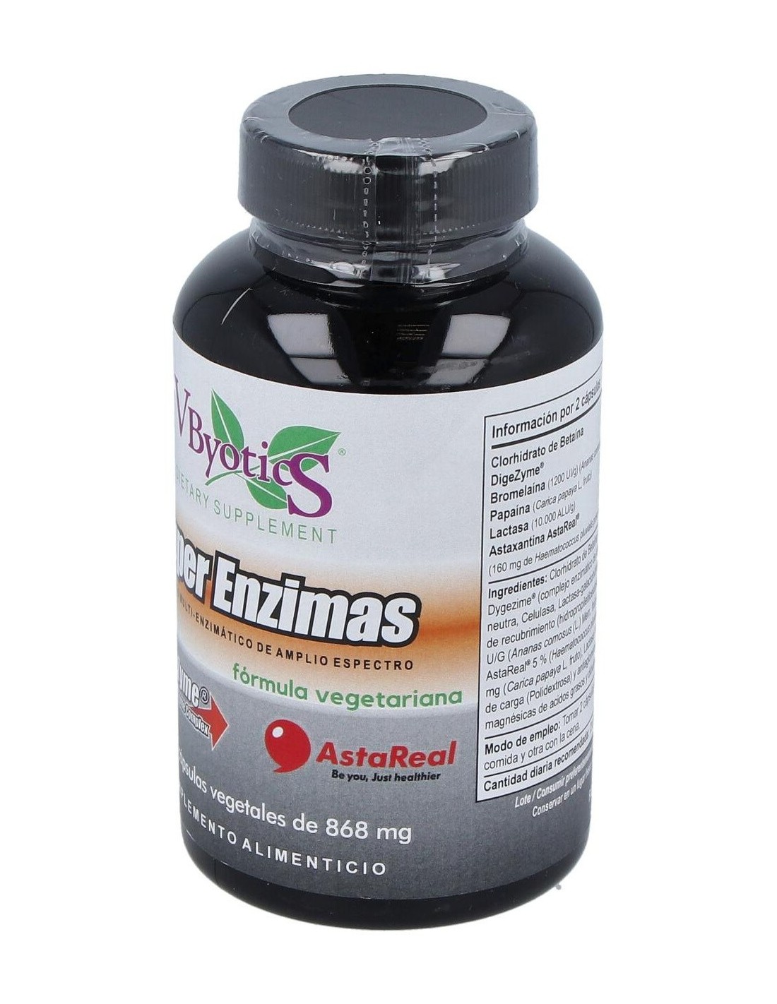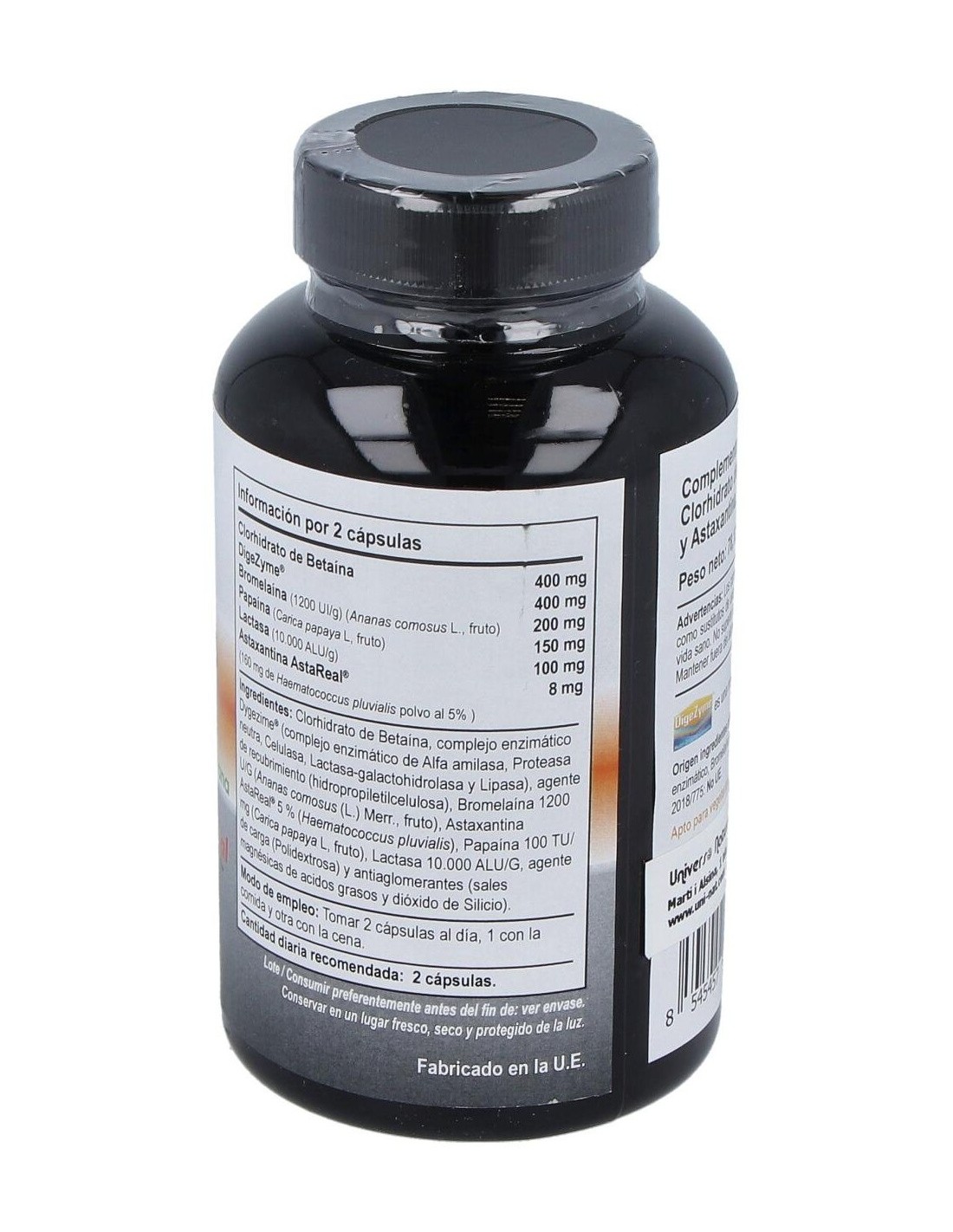 Clorhidrato de Betaína, complejo enzimático Dygezime® (complejo enzimático de Alfa amilasa, Proteasa neutra, Celulasa, Lactasa-galactohidrolasa y Lipasa), agente de recubrimiento (hidropropiletilcelulosa), Bromelaína 1200 U/G (Ananas comosus (L.) Merr., fruto), Astaxantina AstaReal® 5 % (Haematococcus pluvialis), Papaína 100 TU/ mg (Carica papaya L, fruto), Lactasa 10.000 ALU/G, agente de carga (Polidextrosa) y antiaglomerantes (sales magnésicas de acidos grasos y dióxido de Silicio).