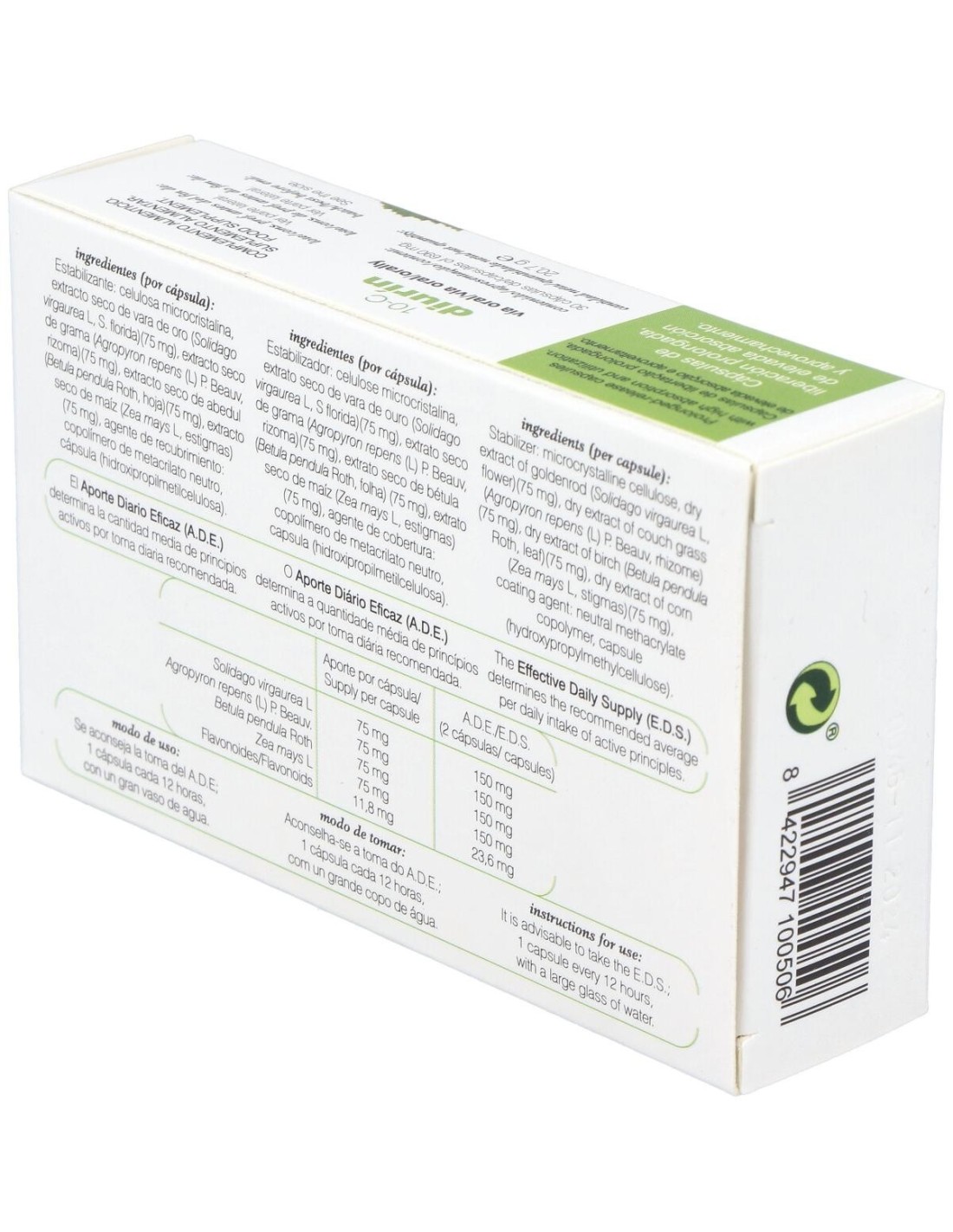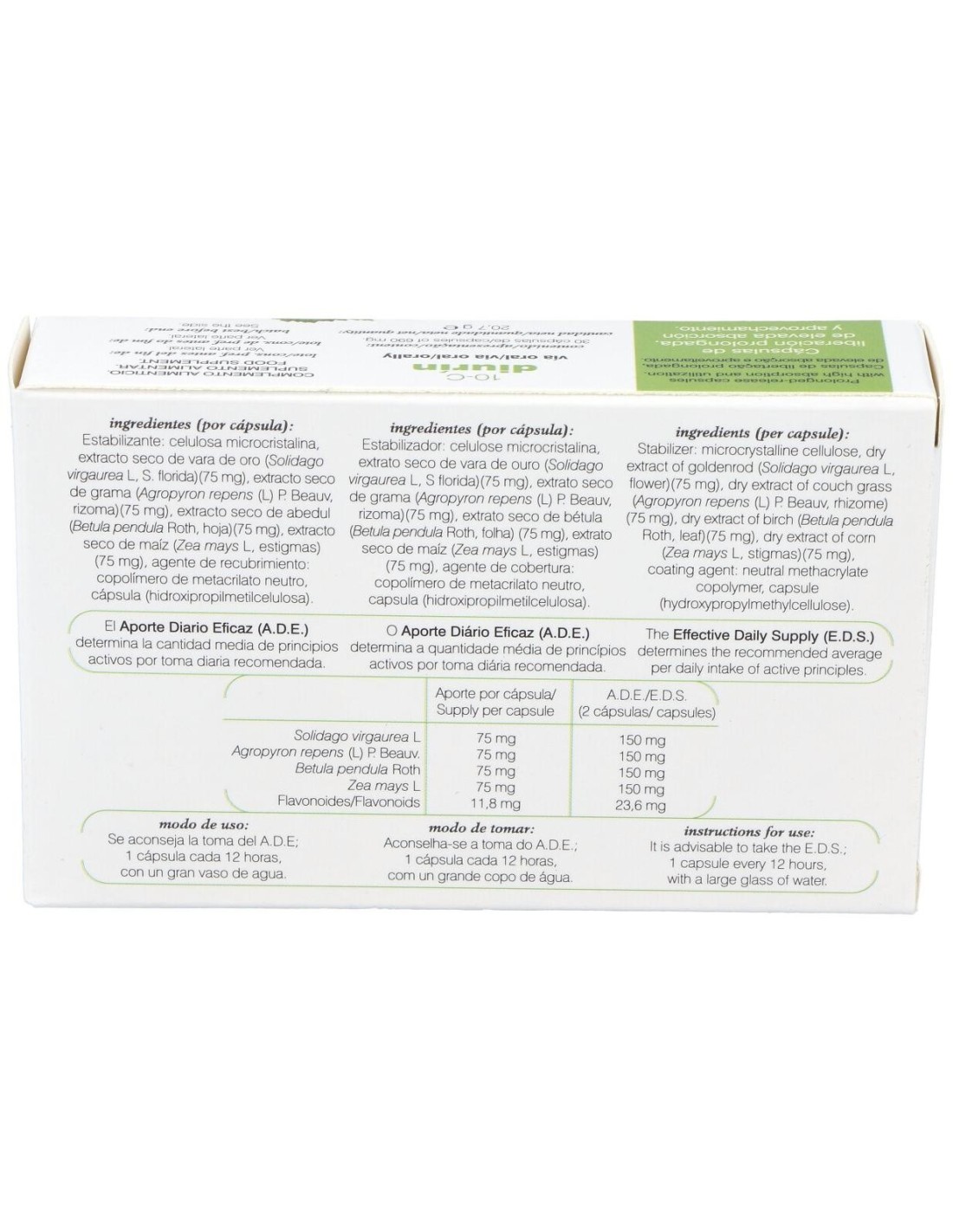 Ingredientes:Estabilizante: celulosa microcristalina, extracto seco de vara de oro (Solidago virgaurea L, S. florida) (75 mg), extracto seco de grama (Agropyrum repens L)P. Beauv, rizoma (75 mg), extracto seco de abedul (Betula pendula Roth, hoja) (75 mg), extracto seco de maíz (Zea mays L., estigmas) (75 mg), agente de recubrimiento: copolímero de metacrilato neutro, cápsula (hidroxipropilmetilcelulosa).Modo de empleo:Tomar 1 cápsula cada 12 horas.Presentación:Envase de 30 cápsulas.