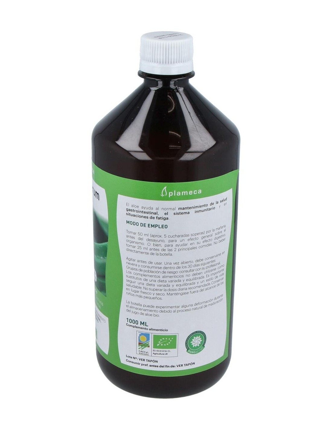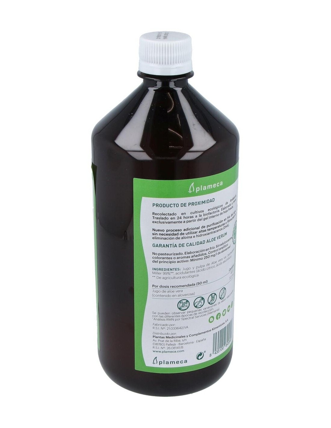 2. Análisis por Spectral Services (Alemania). Debido a la ausencia de colorantes y saborizantes, el consumidor puede observar pequeñas variaciones de sabor relacionadas con las diferentes épocas de recolección.Ingredientes:Jugo y pulpa de Aloe vera var. barbadensis Miller 99%, acidulantes (ácido cítrico y ácido ascórbico).Modo de empleo:Tomar 50 ml por la mañana, antes del desayuno, para un efecto general sobre el organismo. O bien, para potenciar su efecto digestivo, tomar 25 ml antes de las principales comidas.Presentación:Envase de 1 litro.Recomendación y advertencias:No contiene gluten ni lactosa.