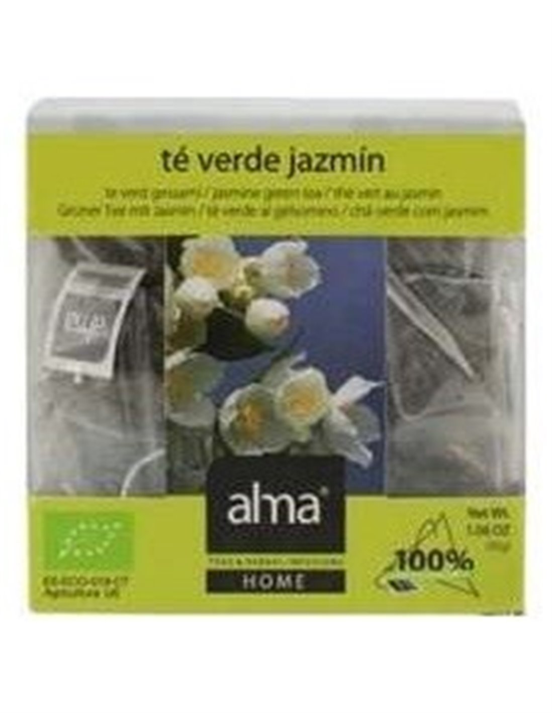 Alma Home Té Verde Jazmin 15 Bolsas té verde de infusión clara con acentuado aroma a Jazmín, sus ingredientes son 100% ecológicos. Proporciona calor y alivio en nuestro cuerpo.
