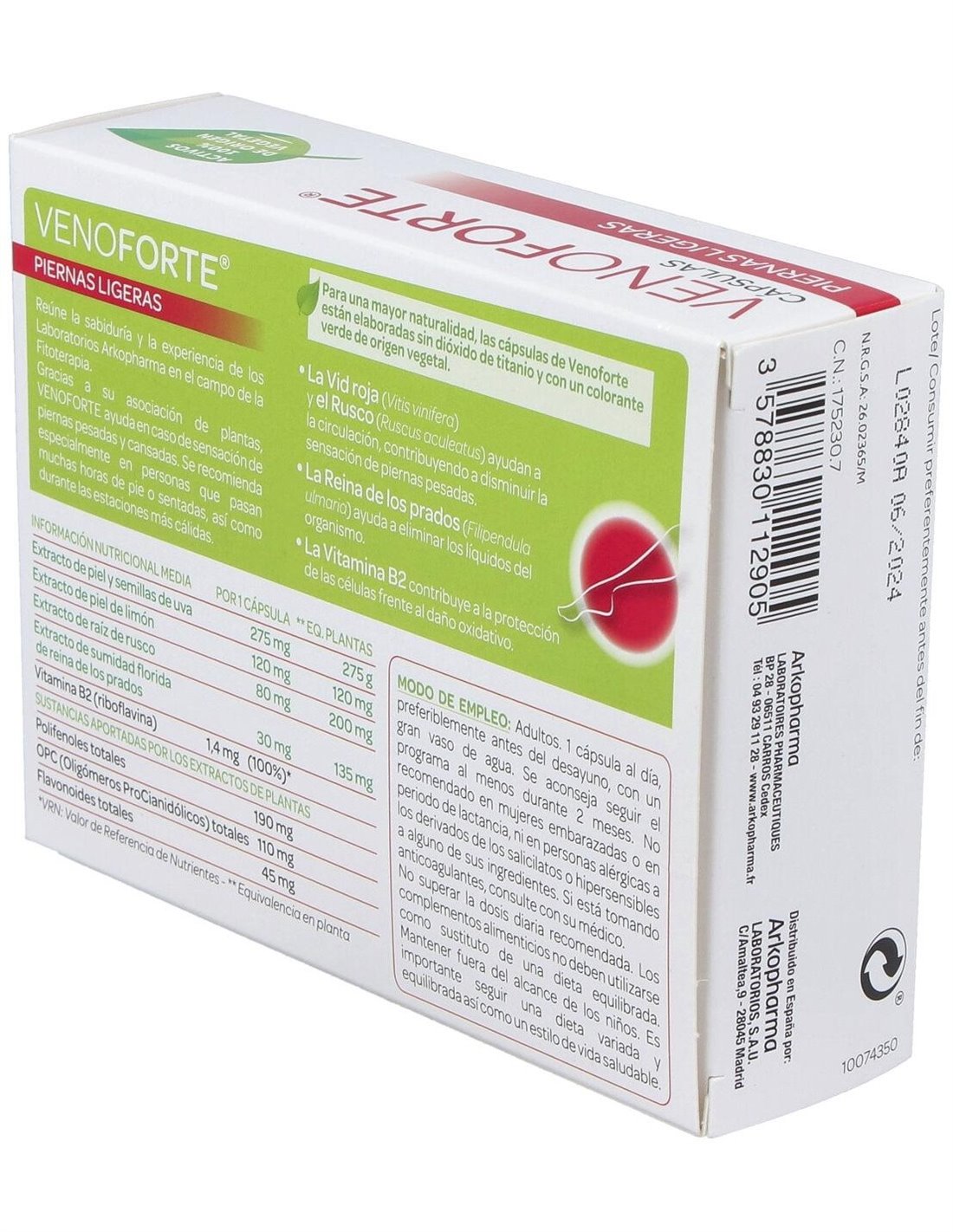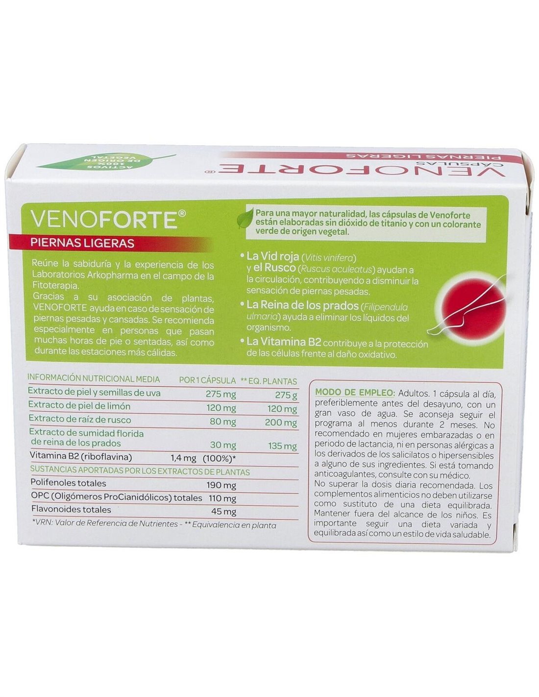 Extracto de piel y semillas de fruto de vid roja (Vitis vinifera L.) - Extracto de piel de limón (Citrus limonum (L.) Burm. F.) con una valoración del 35% en flavonoides - Extracto de raíz de rusco (Ruscus aculeatus L.) - Fibras de manzana (Malus domestica Borkh.) - Extracto de parte aérea de reina de los prados (Filipendula ulmaria (L.) Max.) - Agente de carga: fosfato de calcio - Antiaglomerante: estearato de magnesio - Vitamina B2. Cubierta de la cápsula: Hidroxipropilmetilcelulosa - Colorante: Complejos cúpricos de clorofilinas. Recubrimiento de origen vegetal: Hidroxipropilmetilcelulosa -colorantes: óxido de hierro y dióxido de titanio.