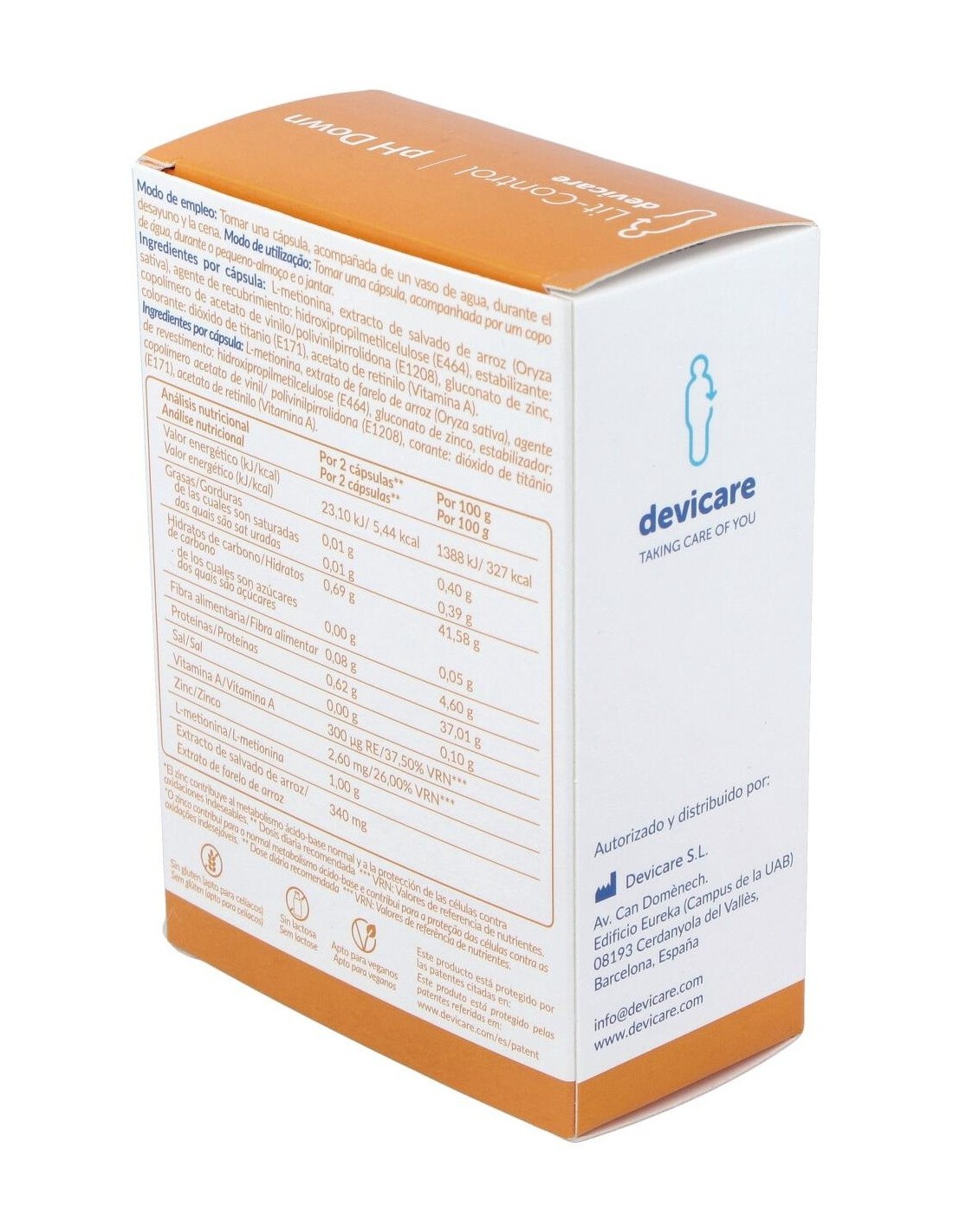 L-Metionina (500 mg), extracto de salvado de arroz (fitato cálcico magnésico), gluconato de zinc, vitamina A. Excipientes: Maltodextrina (agente de carga), dióxido de silicio (antiapelmazante), estearato de magnesio (fluidificante). Cápsula: Hidroxipropilmetilcelulosa (agente de recubrimiento), dióxido de titanio (colorante).