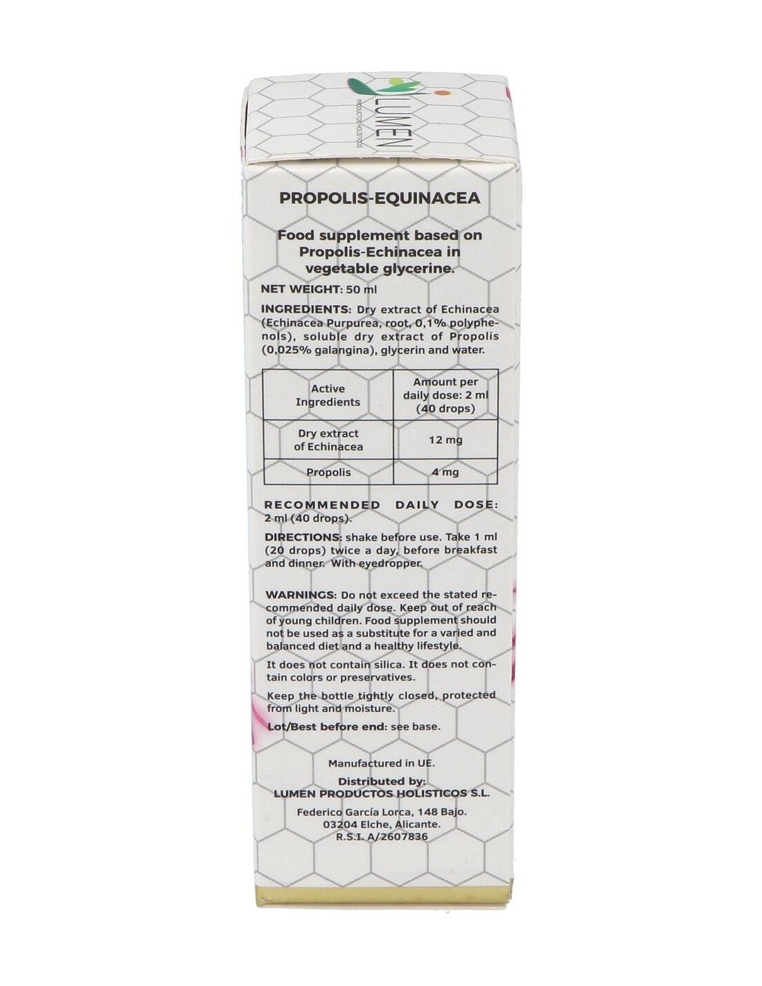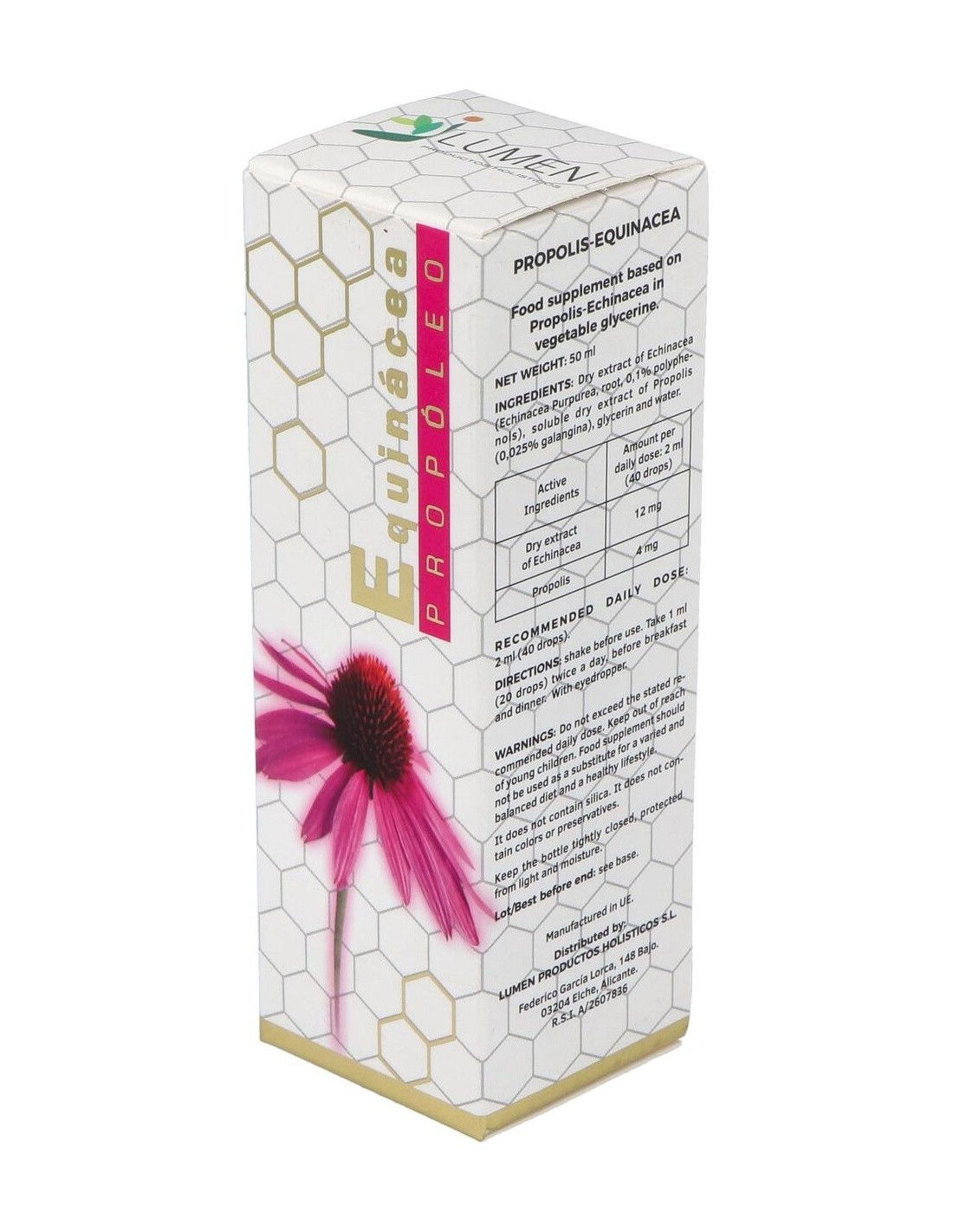 Extracto glicerinado de Equinácea y Propóleo de Lumen. Ambos componentes son estimulantes del sistema inmunitario. Además el propóleo presenta polen y flavonoides, resultando excelente para optimizar las defensas de nuestro organismo y fortalecer el sistema inmune. Reduce el cansancio y la fatiga.
