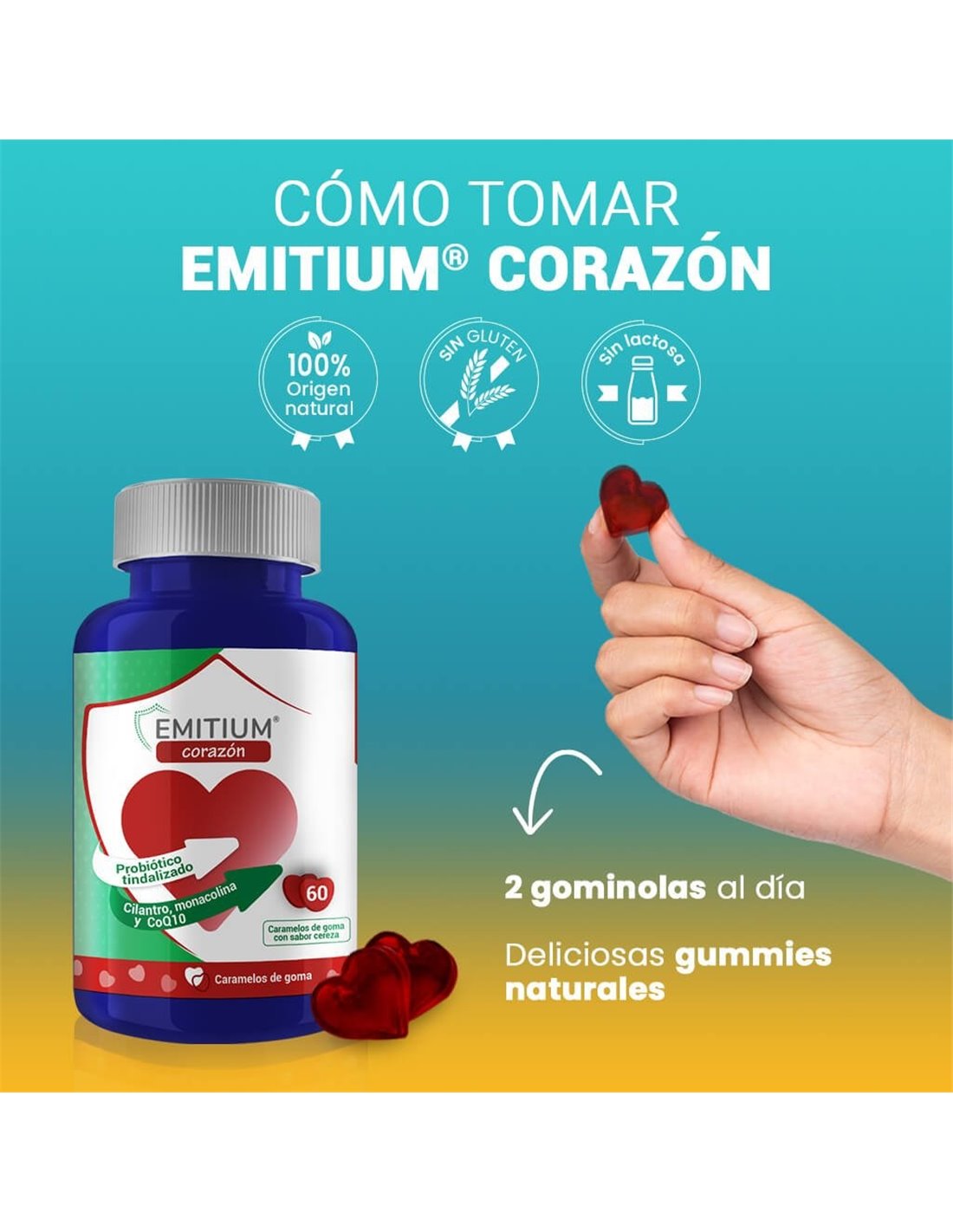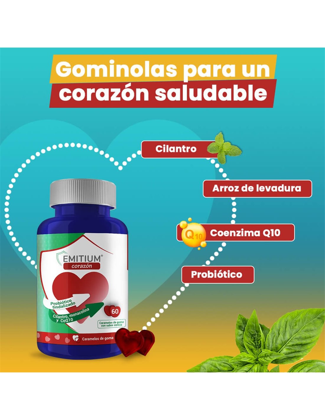 La innovadora fórmula de Emitium® Corazón se presenta en caramelos de goma con Cilantro, arroz de levadura roja, Coenzima Q10 y una cepa probiótica: Lactobacillus reuteri NU-263, que te ayudarán a mantener unos niveles chachis de colesterol.Unos niveles altos de colesterol suponen un riesgo para la salud cardiovascular. Un estilo de vida saludable contribuye a mantener unos niveles adecuados de colesterol y triglicéridos. Emitium Corazón, es el pequeño empujoncito que marcará la diferencia en la lucha contra el colesterol.Composición activa por 2 caramelos de goma: 250 mg de fruto de cilantro PE (apiaceae coriandrum sativum L.). 58 mg de arroz de levadura roja (2,9 mg de monacolina). 10 mg de coenzima Q10. 10 mg de cepa probiótica (1x10E9 UFC lactobacillus reuteri NU-263). Ingredientes:Jarab de glucosa, azúcar, agua, fruto de cilantro PE (apiaceae coriandrum sativum L.), gelificante (pectina), acidulante (ácido cítrico), arroz de lecadura roja, corrector de acidez (citrato trisódico), aceite vegetal (aceite de coco), aroma (aroma natural), coenzima Q10, lactobacillus reuteri NU-263 y antiaglomerantes (cera de carnaúba).Modo de empleo:Tomar 2 caramelos de goma al día.Presentación:Envase de 60 caramelos de goma sabor cereza.Recomendaciones y advertencias:No contiene gluten, azúcares añadidos ni lactosa.