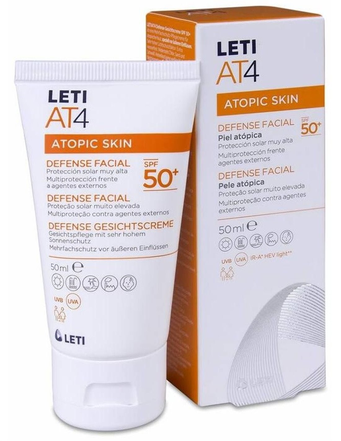 Letiat4 Defense Facial SPF50+ es un multiprotector facial para adultos y niños especialmente indicado para el cuidado diario de pieles atópicas, secas y sensibles. Gracias al efecto barrera multiprotectora, que crean ingredientes como la manteca de karité, ayuda a prevenir el estrés oxidativo y los sintomas de la piel atópica, que pueden empeorar agentes externos como el sol, el cloro, la arena, la contaminación o el sudor.
