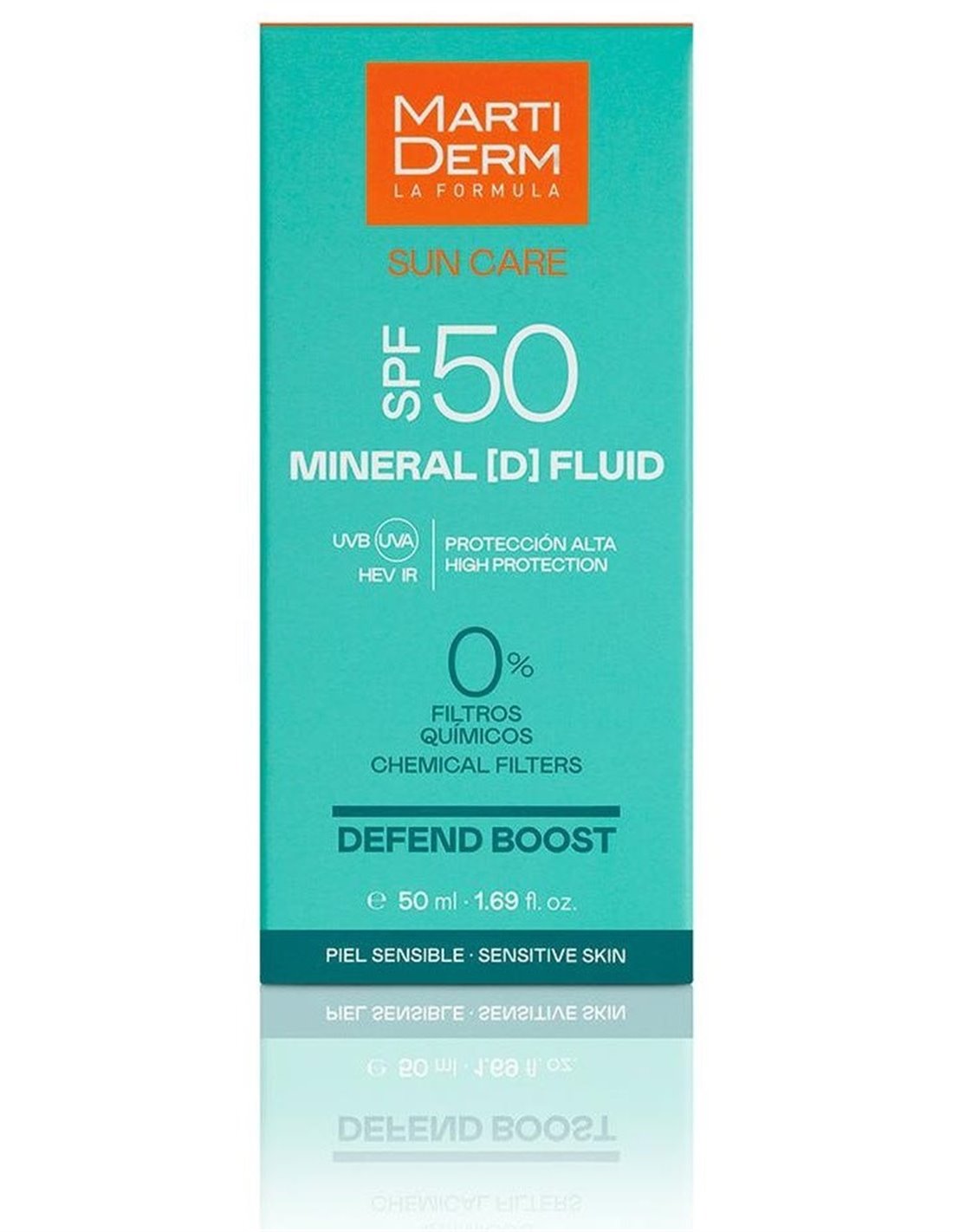 Martiderm Sun Care Mineral D Fluid Defend Boost SPF50 50ml es un fotoprotector solar facial de muy alta protección SPF50+ con filtros minerales de acción anti UV, IR y luz azul.